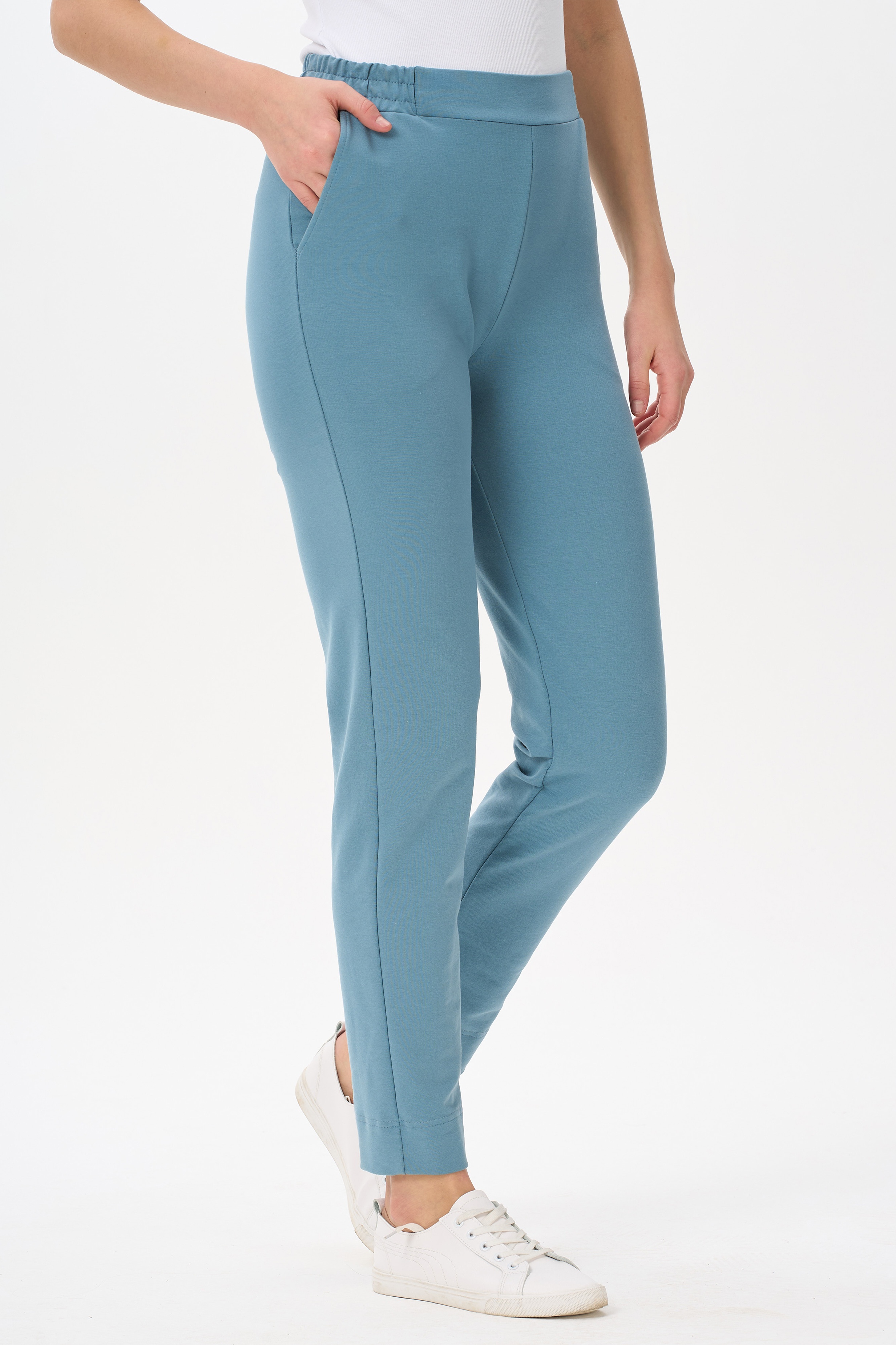 80% хлопок, 14% полиэстер, 6% эластан Зауженные брюки с карманами, из хлопкового полотна френчтерри. Пояс с планкой и эластичной лентой внутри. Длина брюк регулируется подворотом. Рост модели 175 см.