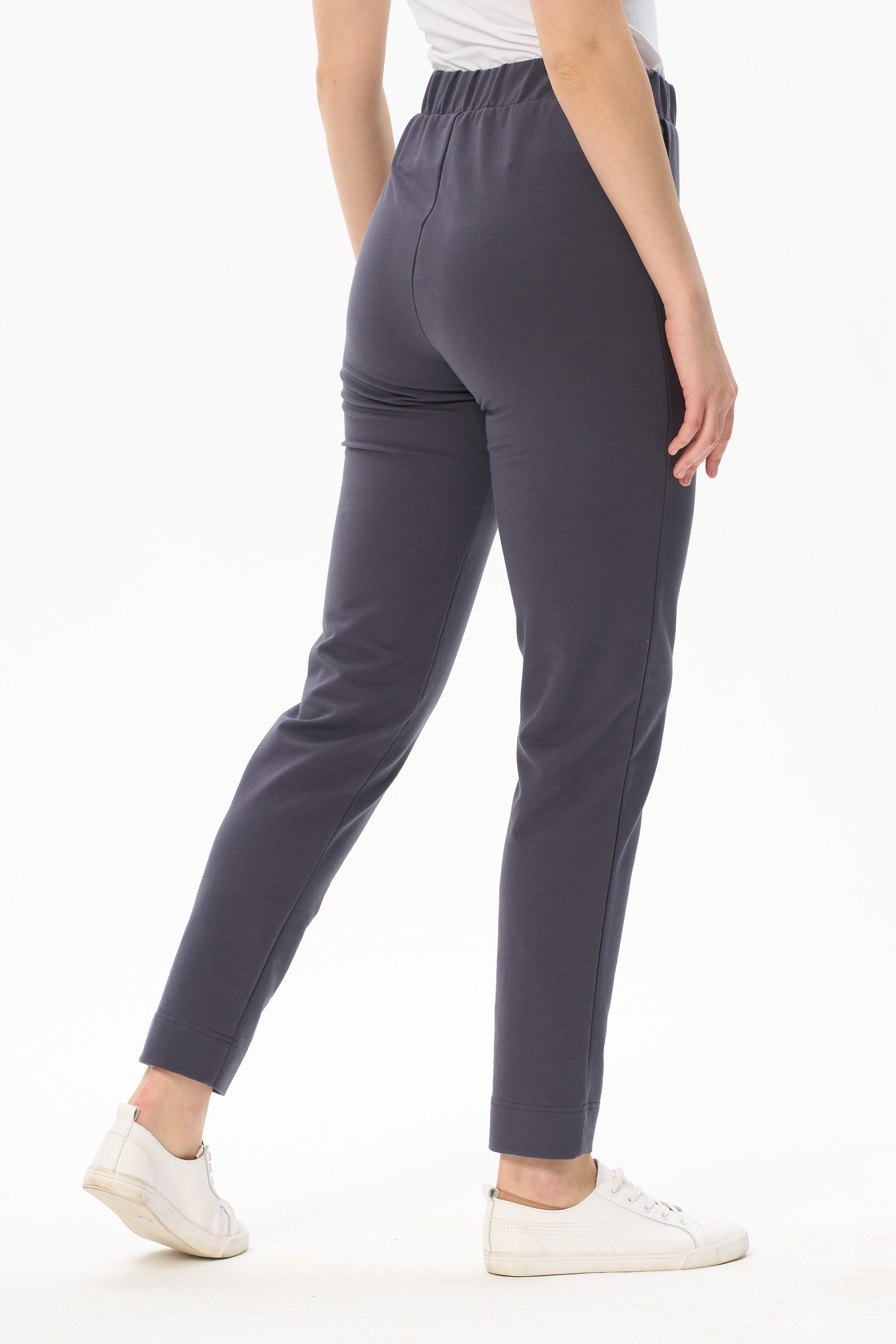 Зауженные брюки с карманами, из хлопкового полотна футер (без начеса). Пояс с планкой и эластичной лентой внутри. Длина брюк регулируется подворотом. Длина по боковому шву (без учета пояса) в 44 размере - 98см. Рост модели 178 см.