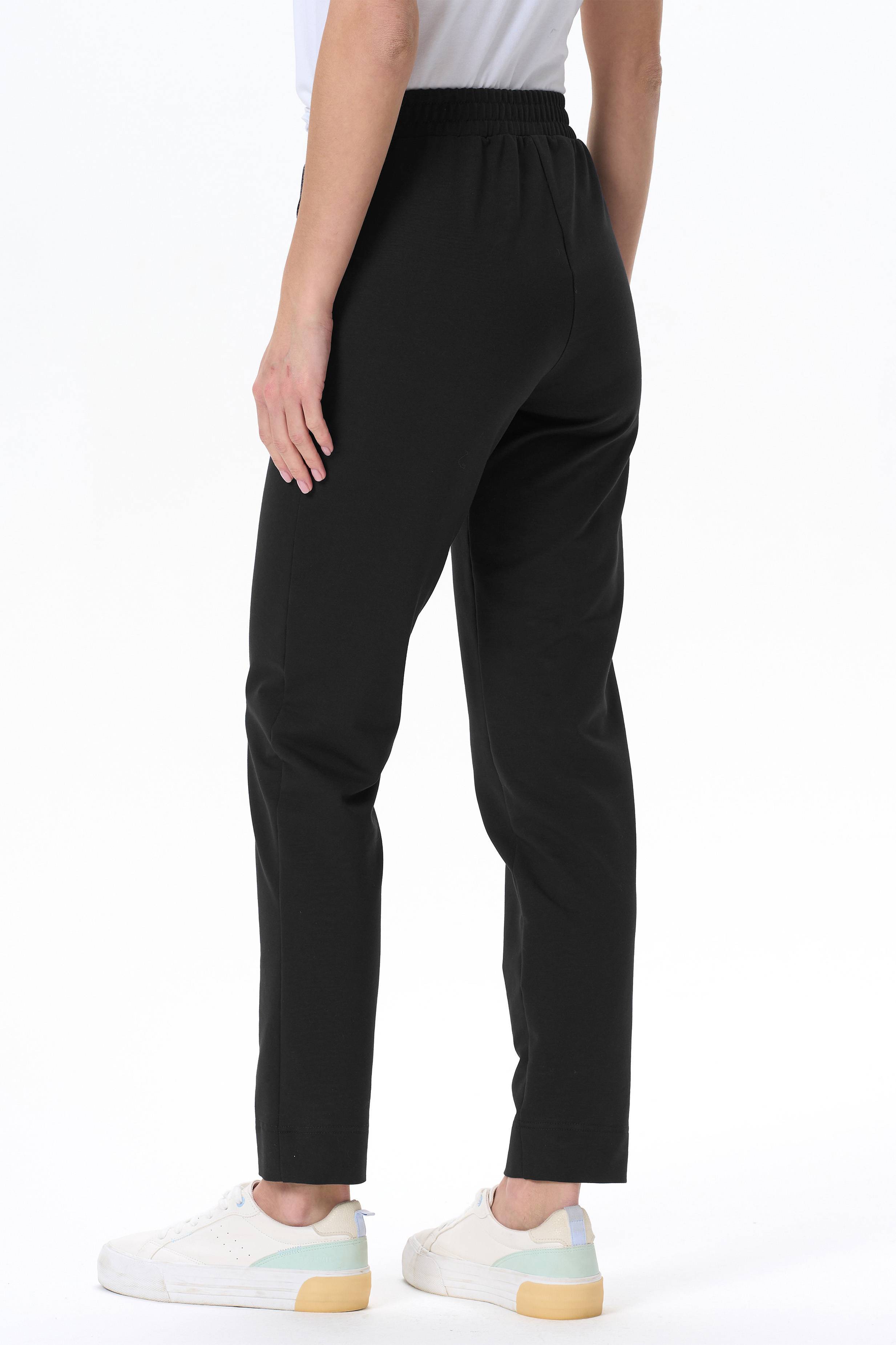 Зауженные брюки с карманами, из хлопкового полотна футер (без начеса). Пояс с планкой и эластичной лентой внутри. Длина брюк регулируется подворотом. Длина по боковому шву (без учета пояса) в 44 размере 98см. Рост модели 177.