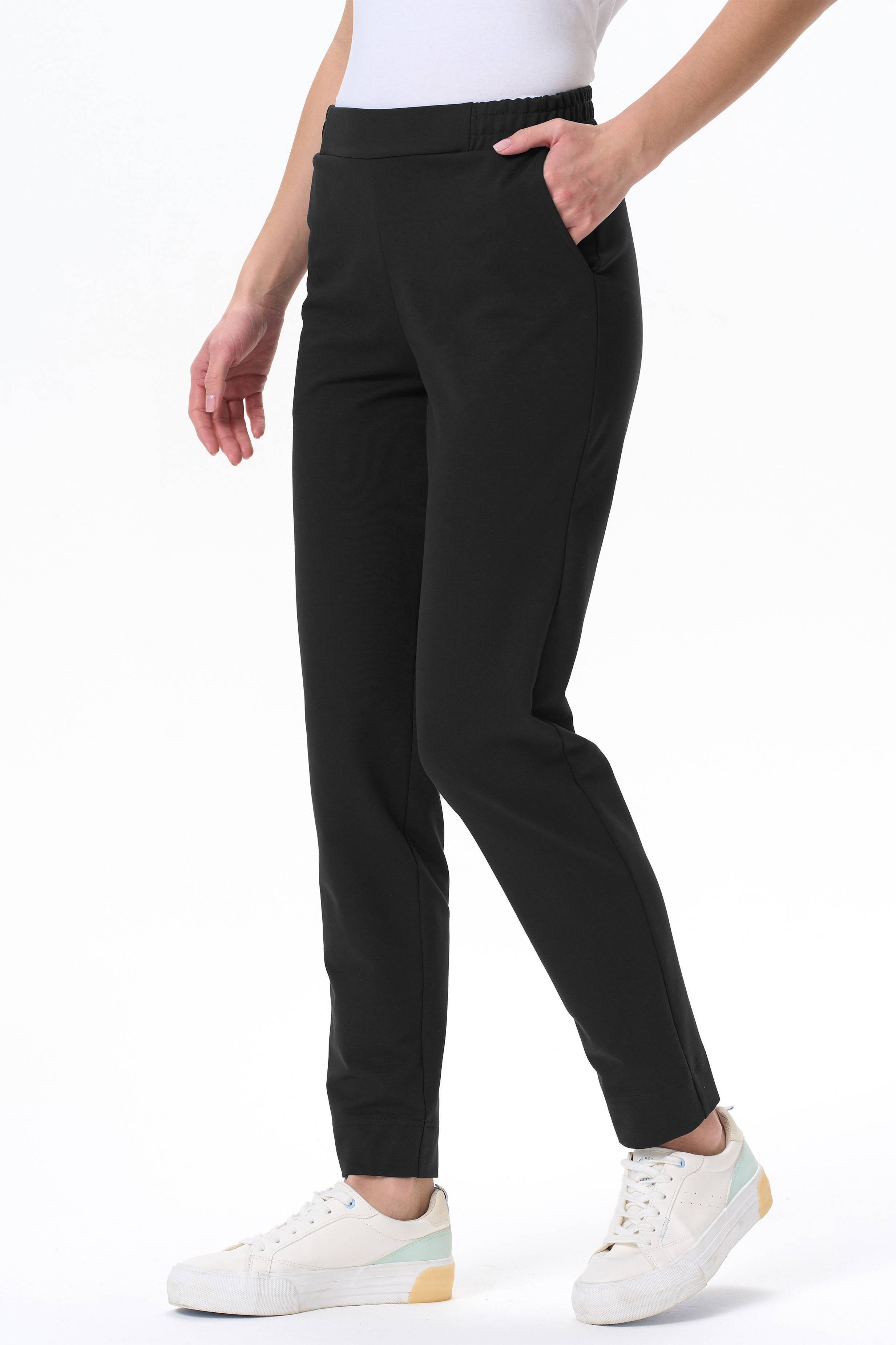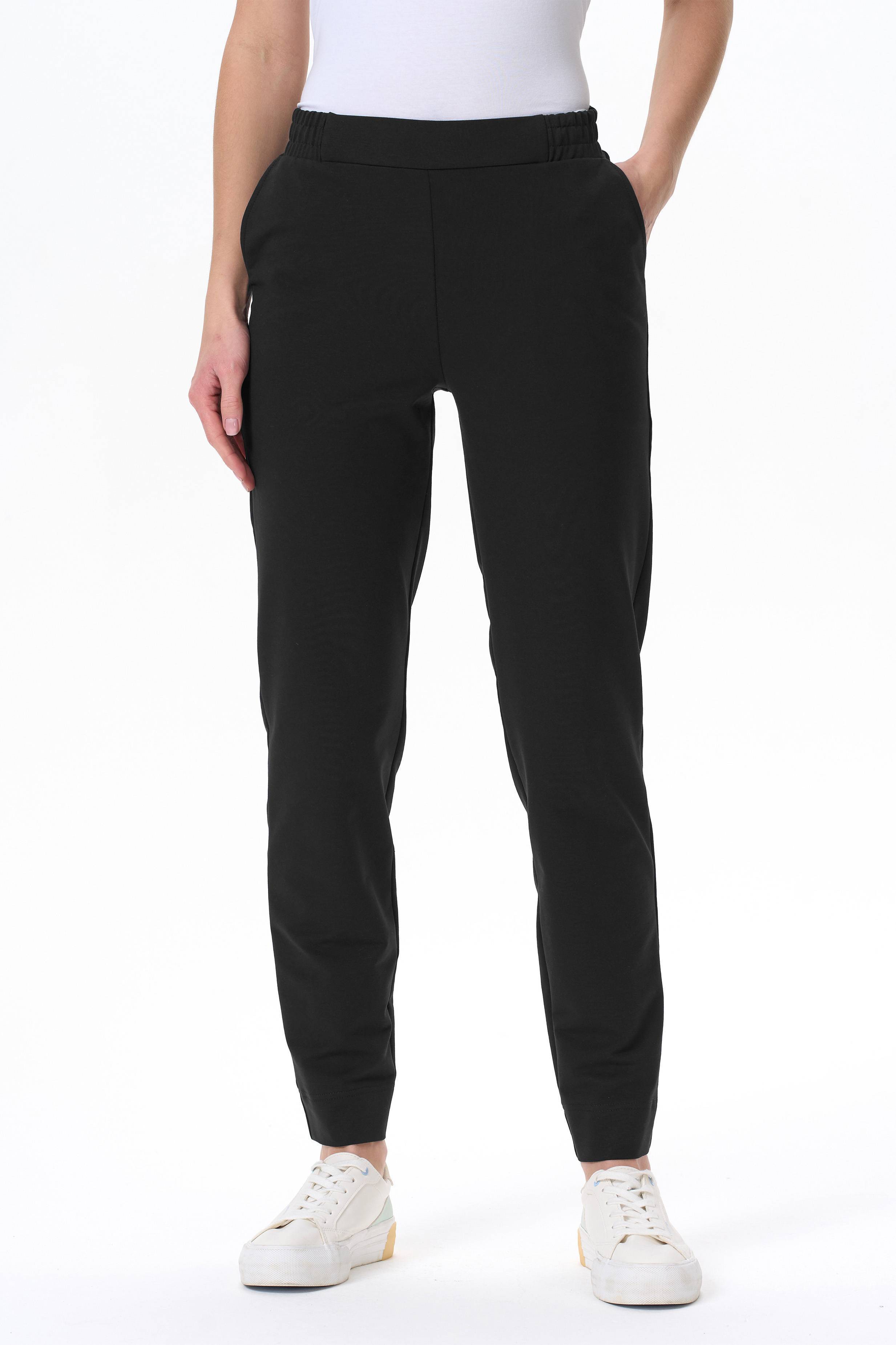 80% хлопок, 14% полиэстер, 6% эластан Зауженные брюки с карманами, из хлопкового полотна футер (без начеса). Пояс с планкой и эластичной лентой внутри. Длина брюк регулируется подворотом. Длина по боковому шву (без учета пояса) в 44 размере 98см. Рост модели 177.