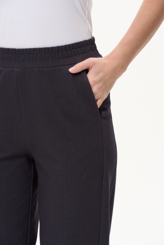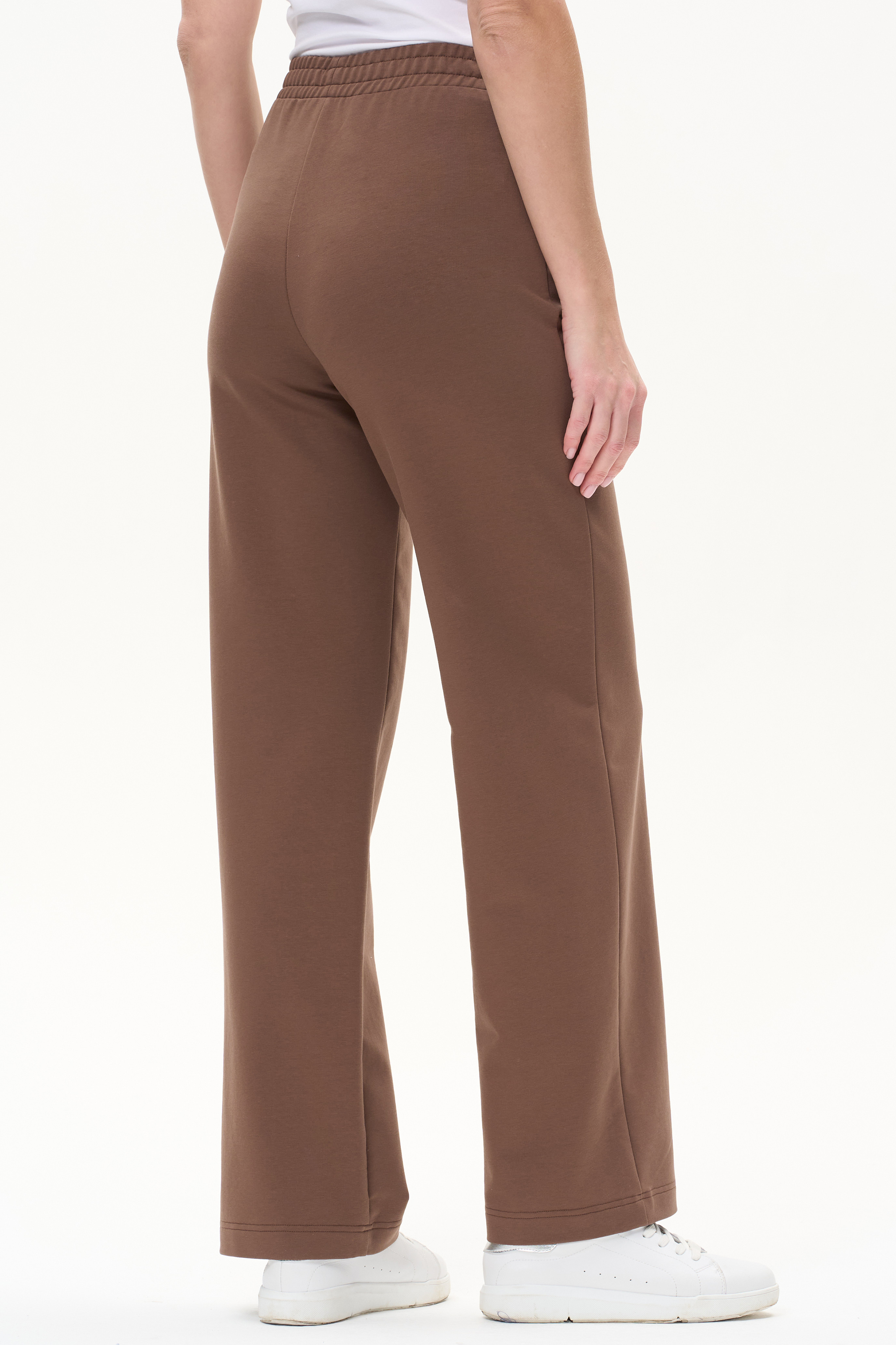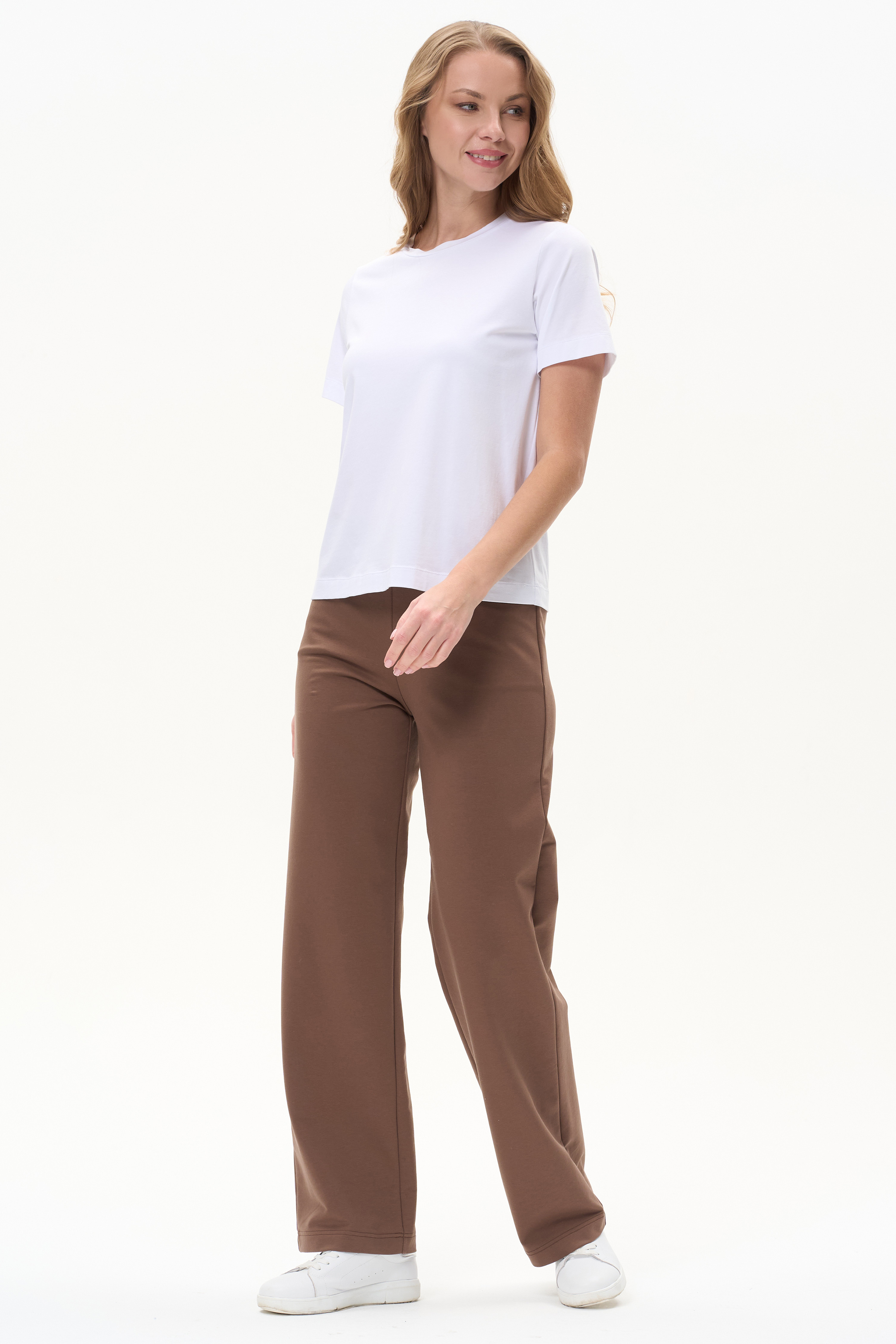 80% хлопок, 14% полиэстер, 6% эластан Повседневные, прямые брюки с карманами из хлопкового полотна френчтерри. Пояс выполнен из основного полотна с эластичной лентой внутри. По бокам фигурные карманы. Длина брюк по боковому шву (без пояса) в 44 размере - 104 см. Рост модели 175 см.