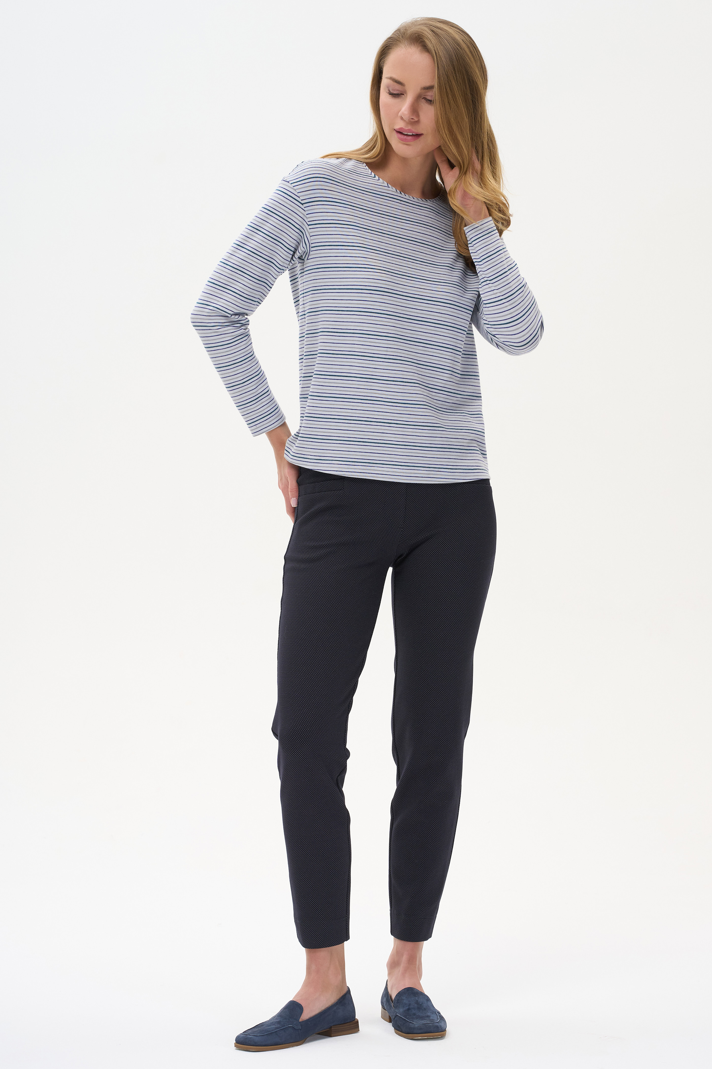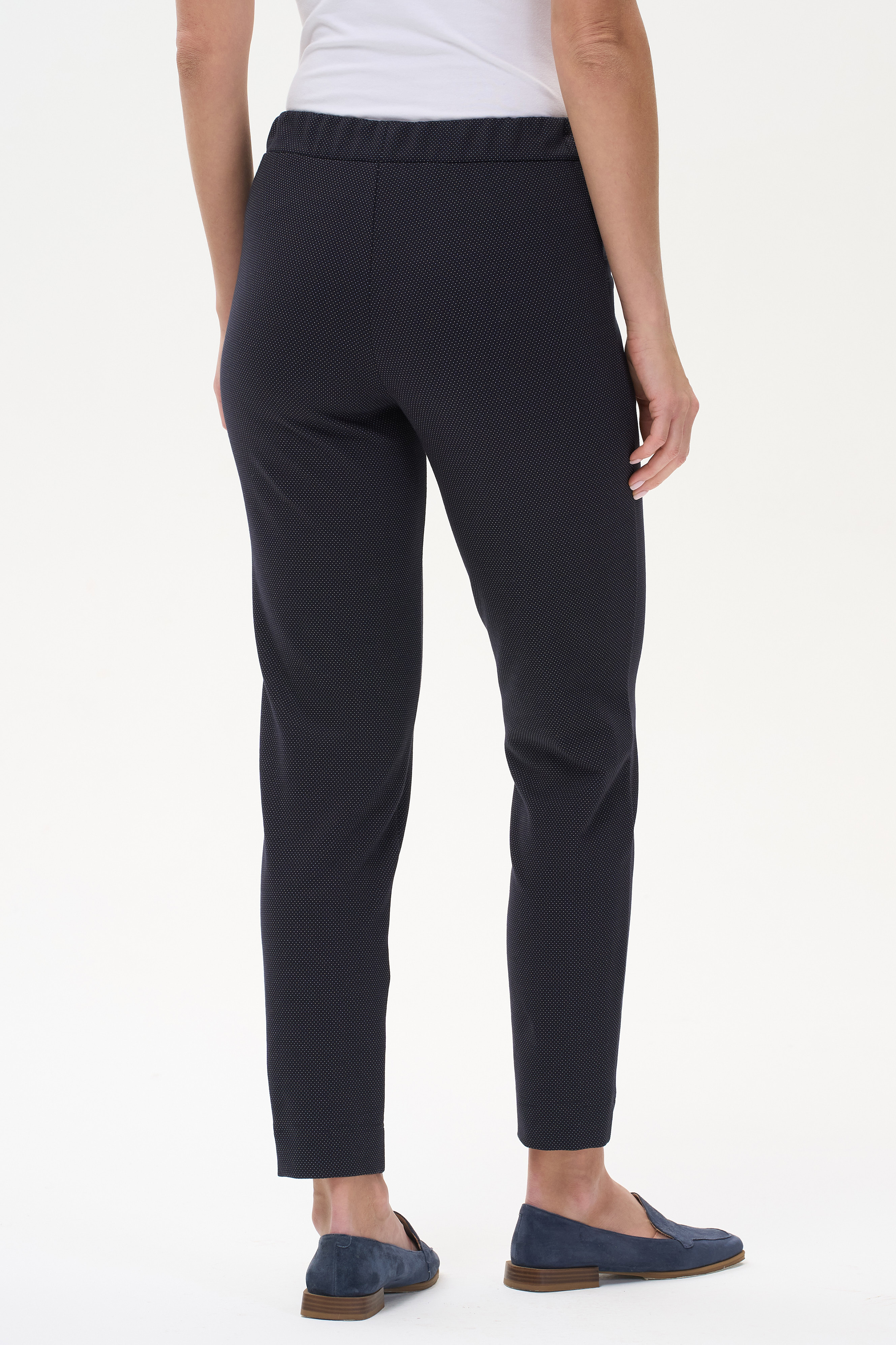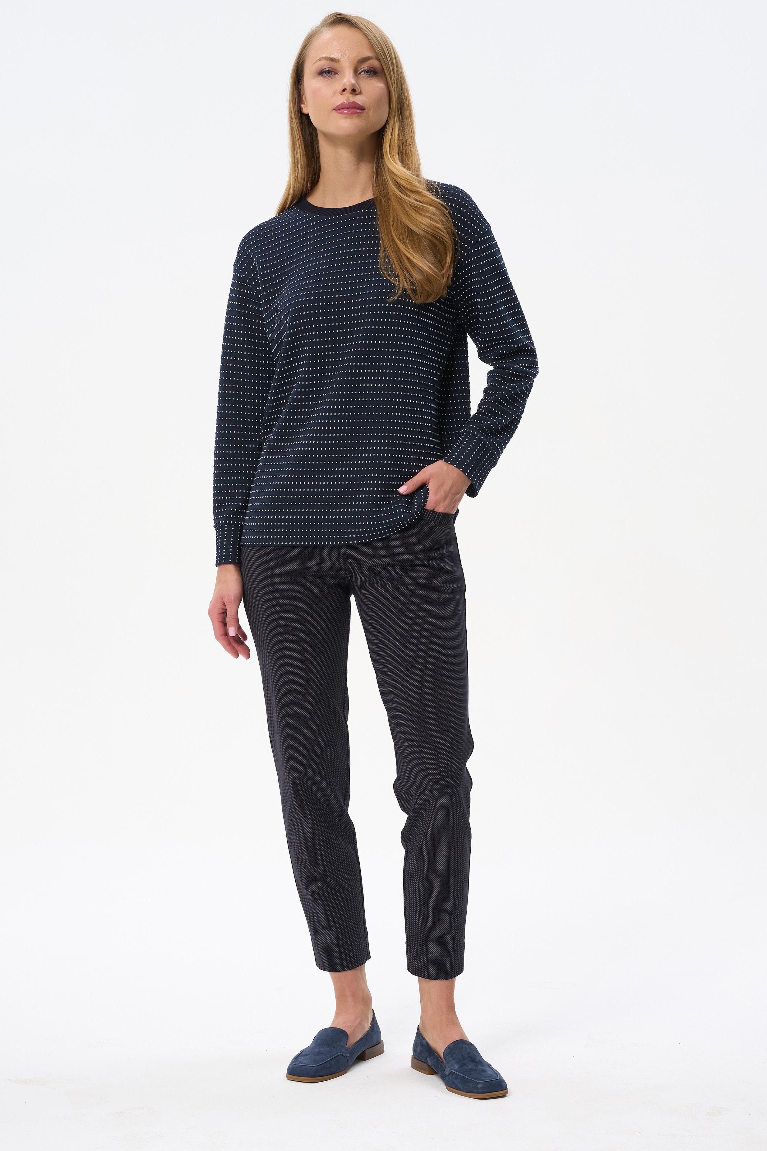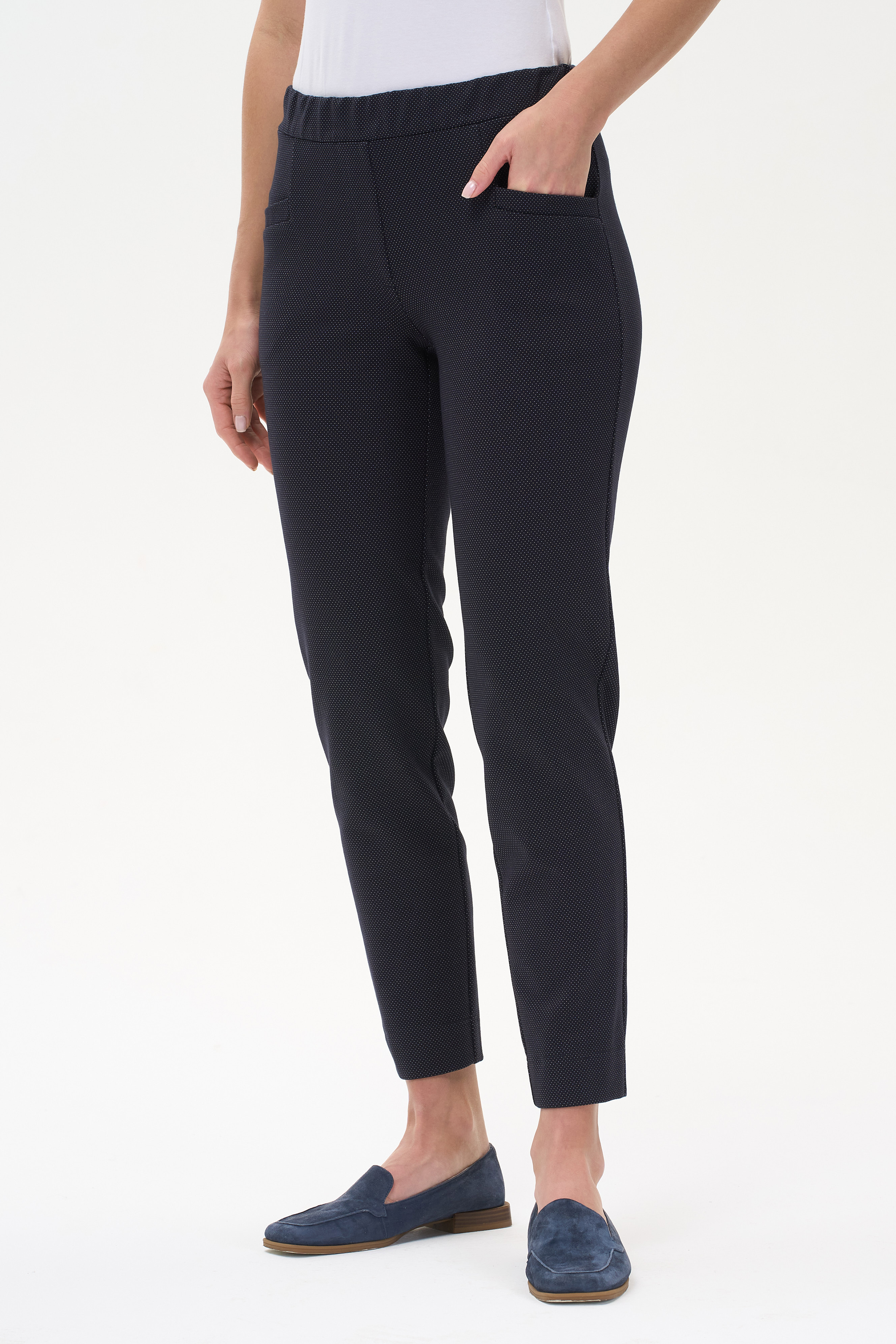 Удобные зауженные брюки выполнены из элластичного вискозного жаккардового, трикотажного полотна. Пояс с эластичной тесьмой внутри, фигурные карманы. Длина по боковому шву в 44 размере 92 см. Рост модели на фото 178 см.