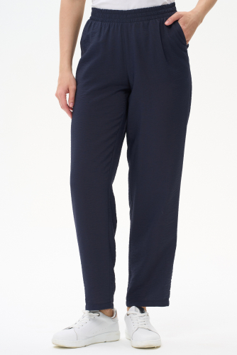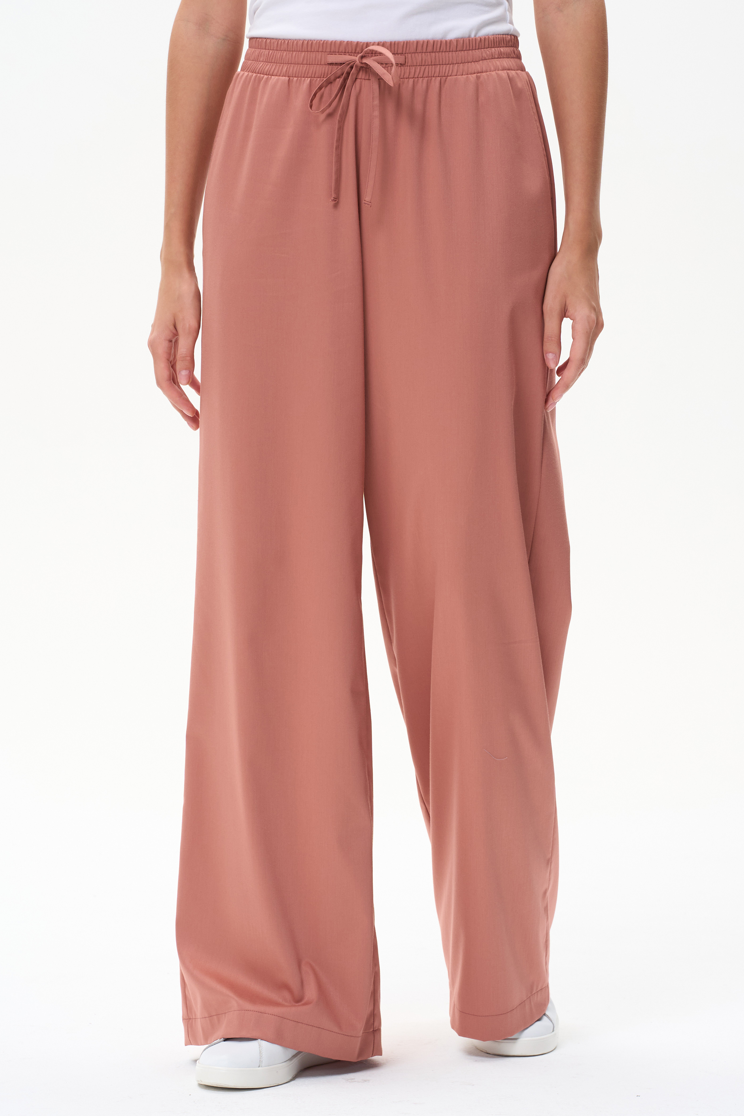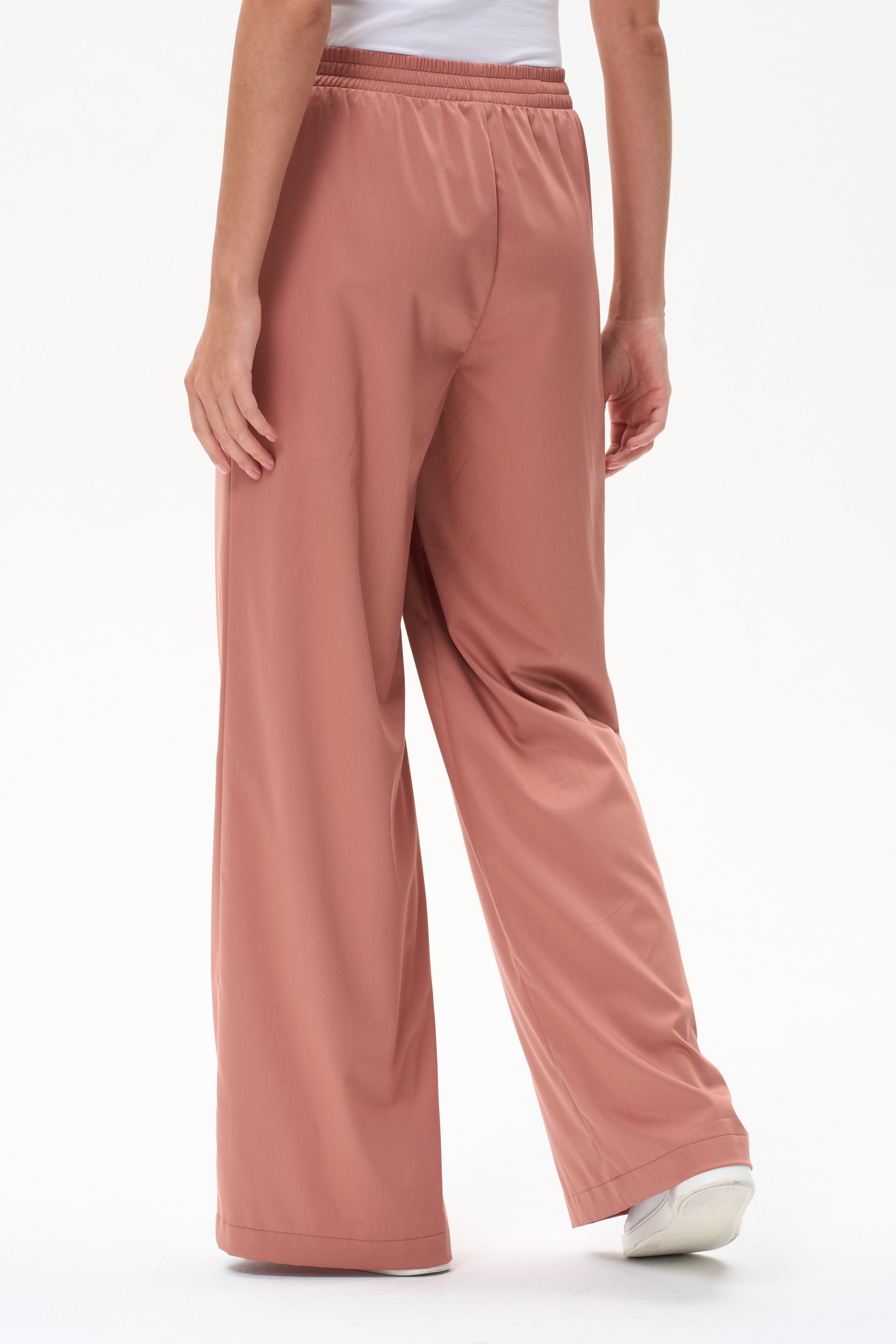 50% бамбук, 27% вискоза, 20% полиэстер, 3% эластан Прямые свободные брюки полной длины. Благодаря эксклюзивной ткани с бамбуком модель выглядят нарядно. Комфортные карманы в боковом шве, пояс с эластичной лентой внутри, завязки для регулировки посадки. Рост модели 175 см.
