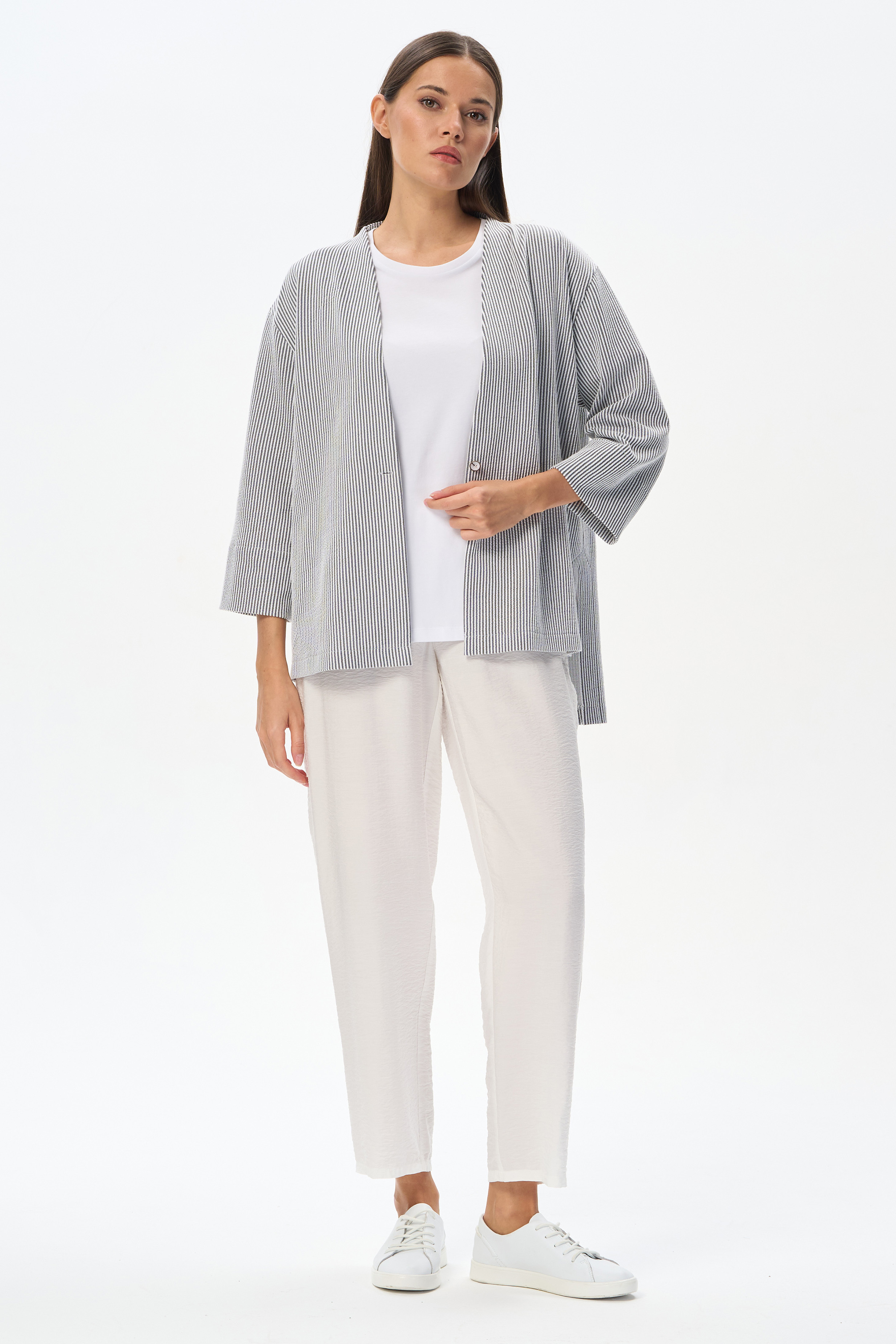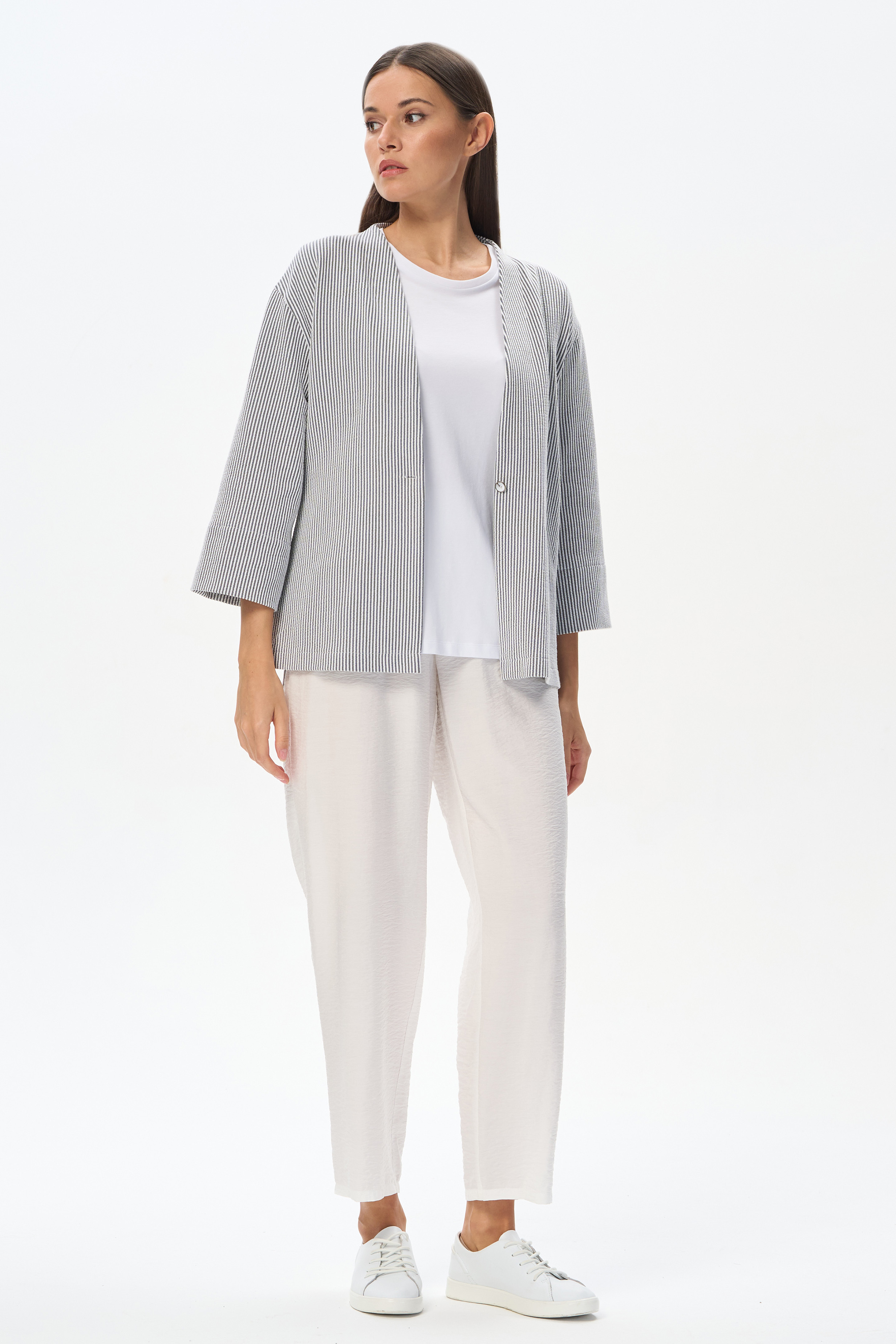 88% вискоза/ 12% полиэстер Зауженные брюки из лёгкой плательной ткани 120 гр в трендовом оттенке Белый песок . Модель свободная, укороченная, классические карманы в боковом шве, пояс с эластичной лентой внутри. Комфортная, лёгкая модель на жаркие дни. Благодаря оттенку подходят ко многим изделиям коллекции. Универсальная модель для офиса, отдыха, путешествий. Рост модели 175 см.