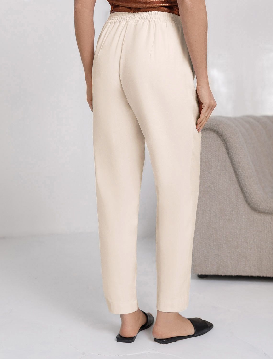 Брюки бананы кокосово-молочного цвета выполнены из плотного лиоцелла. Лиоцелл это более дорогой и экологичный вариант вискозы, очень прочный и шелковистый. Модель отличается свободным кроем в бедрах и заужены к щиколотке. Удобный пояс на мягкой на резинке обеспечивает идеальную посадку по фигуре и гарантирует комфорт. Свободные брюки с высокой посадкой и аккуртными защипами создают идеальный силуэт и будут базовым элементом гардероба. Летние брюки отлично сочетаются с монохромным верхом, с ними можно создавать эффектные наряды как на выход, так и для ежедневных рабочих дел или простых прогулок.