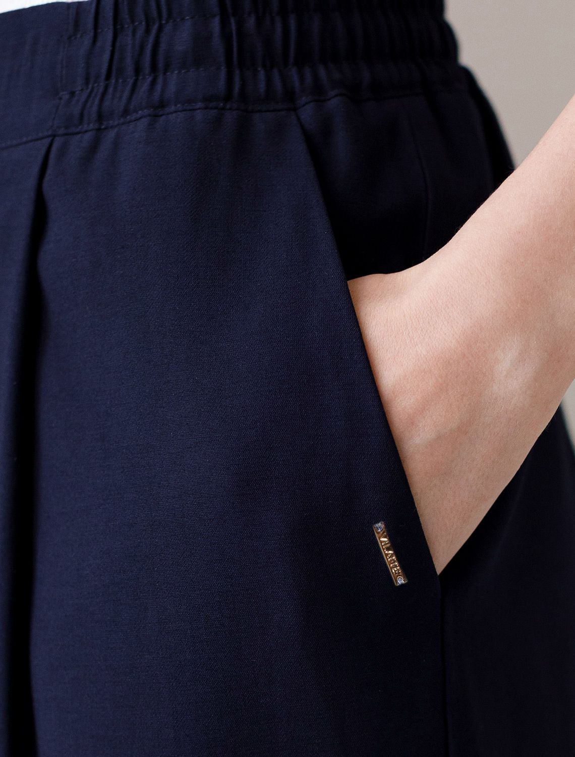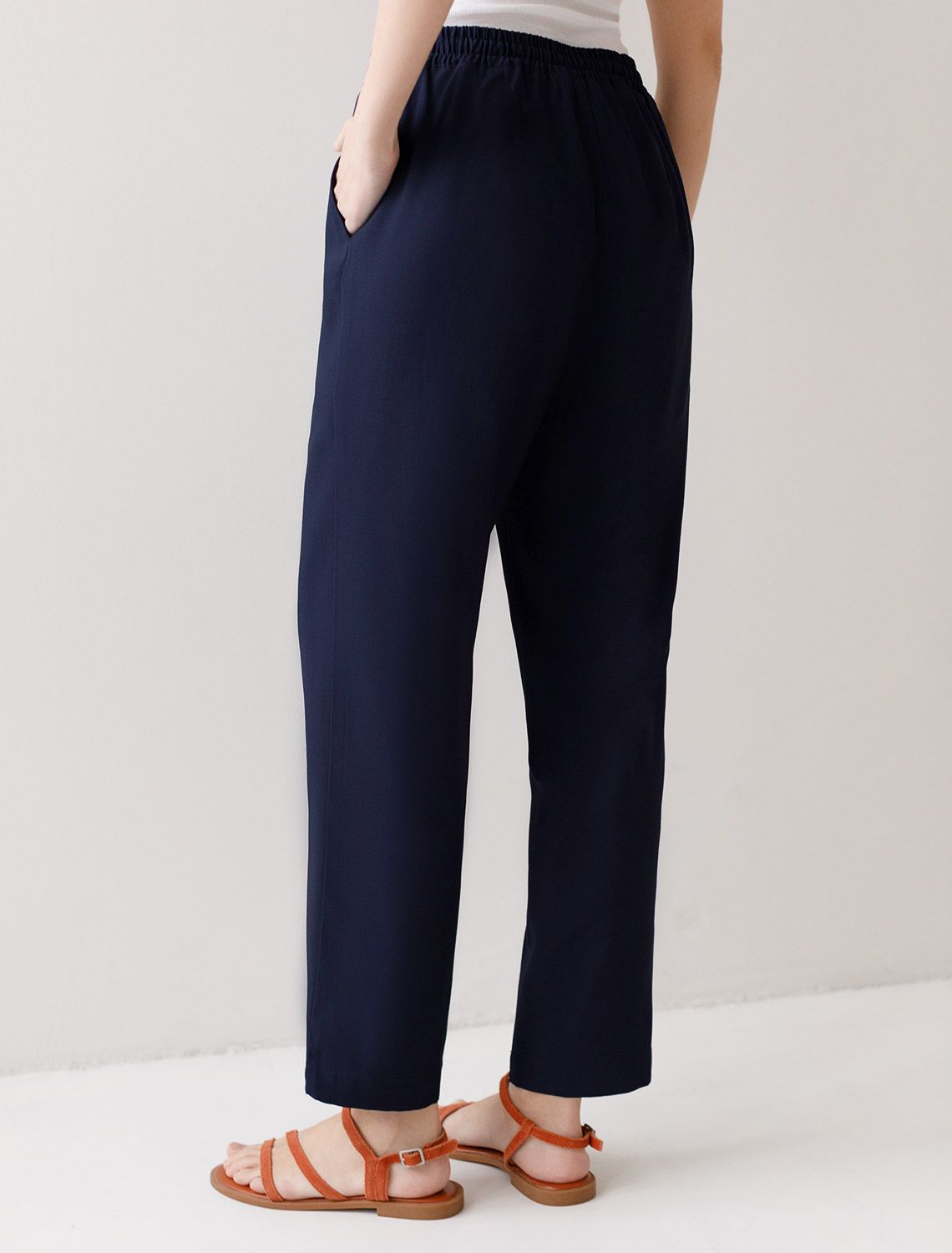 Брюки бананы темно-синего цвета выполнены из плотного лиоцелла. Лиоцелл это более дорогой и экологичный вариант вискозы, очень прочный и шелковистый. Модель отличается свободным кроем в бедрах и заужены к щиколотке. Удобный пояс на мягкой на резинке обеспечивает идеальную посадку по фигуре и гарантирует комфорт. Свободные брюки с высокой посадкой и аккуртными защипами создают идеальный силуэт и будут базовым элементом гардероба. Летние брюки отлично сочетаются с монохромным верхом, с ними можно создавать эффектные наряды как на выход, так и для ежедневных рабочих дел или простых прогулок.