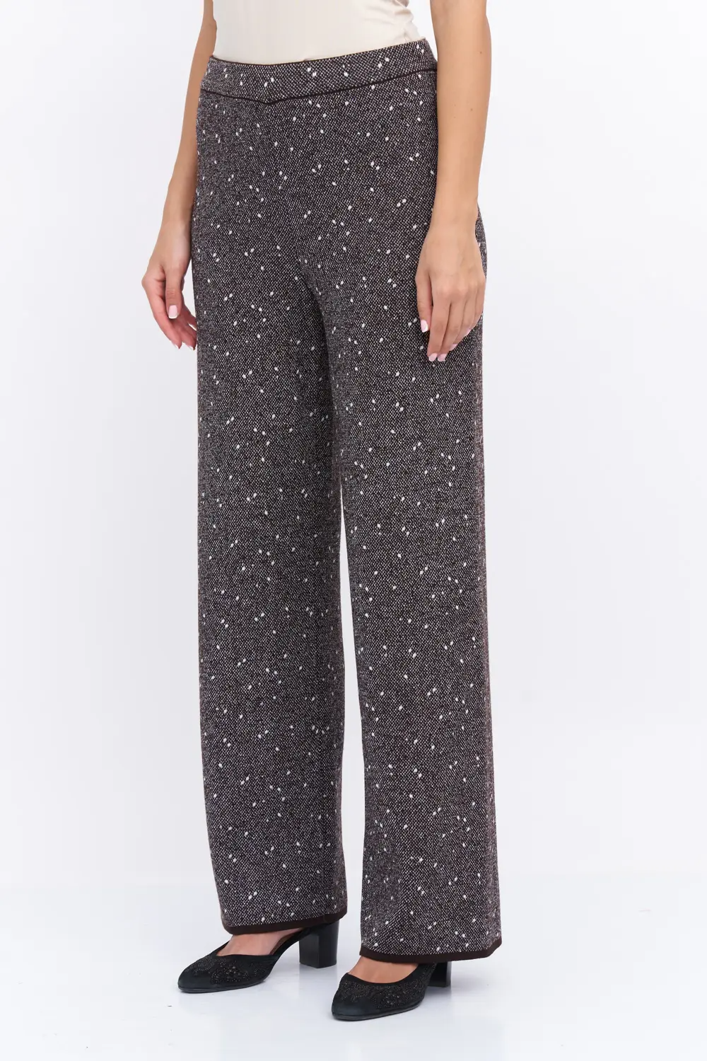 Женские вязаные трикотажные брюки прямого  силуэта на эластичном поясе.  Изделие выполнено жаккардовым переплетением. Трикотажные брюки - идеальный выбор для тех, кто ищет комфорт и стиль в одном. Высокая посадка и прямой крой придает фигуре элегантность, скрывая недостатки и подчеркивая достоинства. Брюки из трикотажной ткани – это тренд, который никогда не выйдет из моды! С ними можно составить деловой, повседневный и строгий образ. Параметры брюк: длина 109 см, длина внутреннего шва 79 см, ширина внизу 27 см шоколад