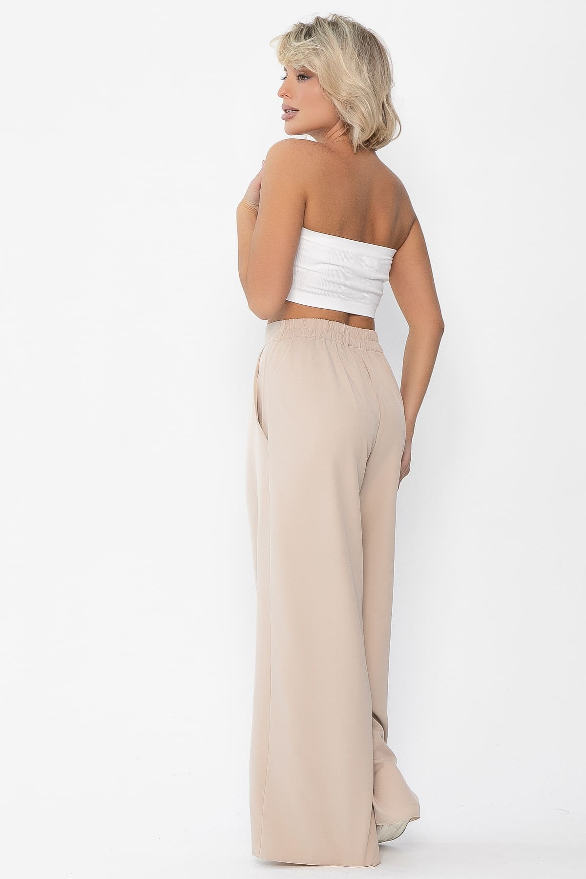 Роскошные брюки палаццо прекрасно подойдут для стильного делового образа. Бежевый цвет позволяет комбинировать их с разнообразным по цвету верхом. Такие брюки отлично подходят на любой случай - на учебу, работу и даже на торжественное мероприятие! Карманы есть в боковых швах. По талии притачной пояс, по спинке резинка.