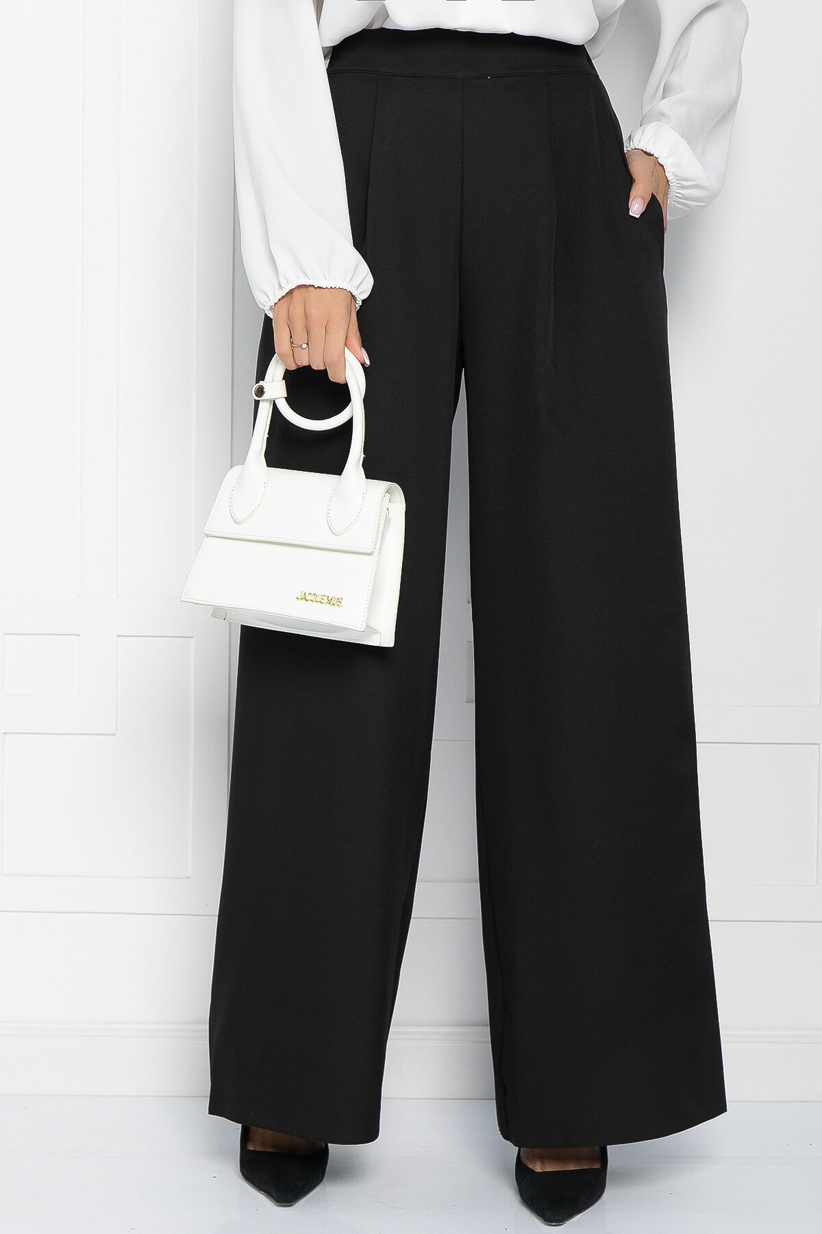 Роскошные брюки палаццо прекрасно подойдут для стильного делового образа. Классический чёрный цвет позволяет комбинировать их с разнообразным по цвету верхом. Такие брюки отлично подходят на любой случай - на учебу, работу и даже на торжественное мероприятие! Карманы есть в боковых швах. По талии притачной пояс, по спинке резинка.