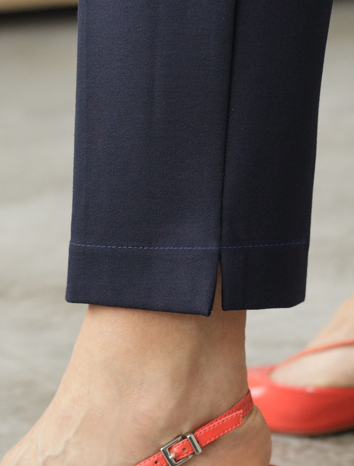 Брюки-дудочки выполнены из джерси. Модель дополнена резинкой сзади, одним вместительным карманом спереди и небольшими боковыми разрезами. Заутюженные стрелки и посадка на талии визуально вытягивают силуэт. Изделие хорошо держит форму, отлично тянется и почти не мнется во время использования. Идеальный вариант в офис или в повседневный классический стиль.