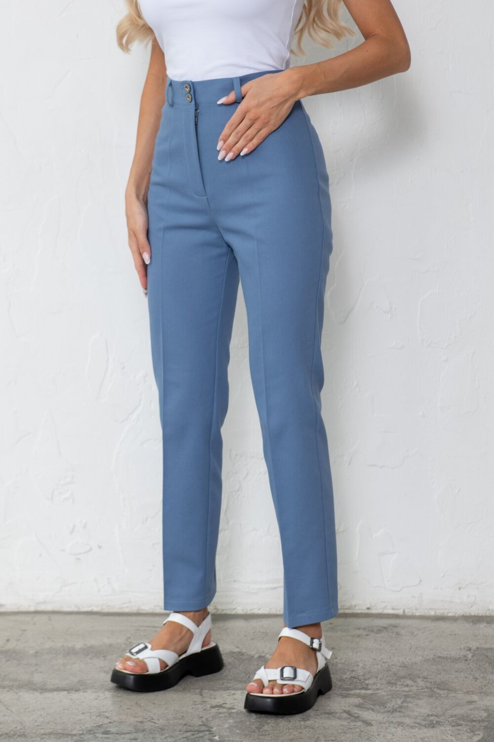 Брюки облегающие, длиной до щиколотки, слегка зауженные книзу.