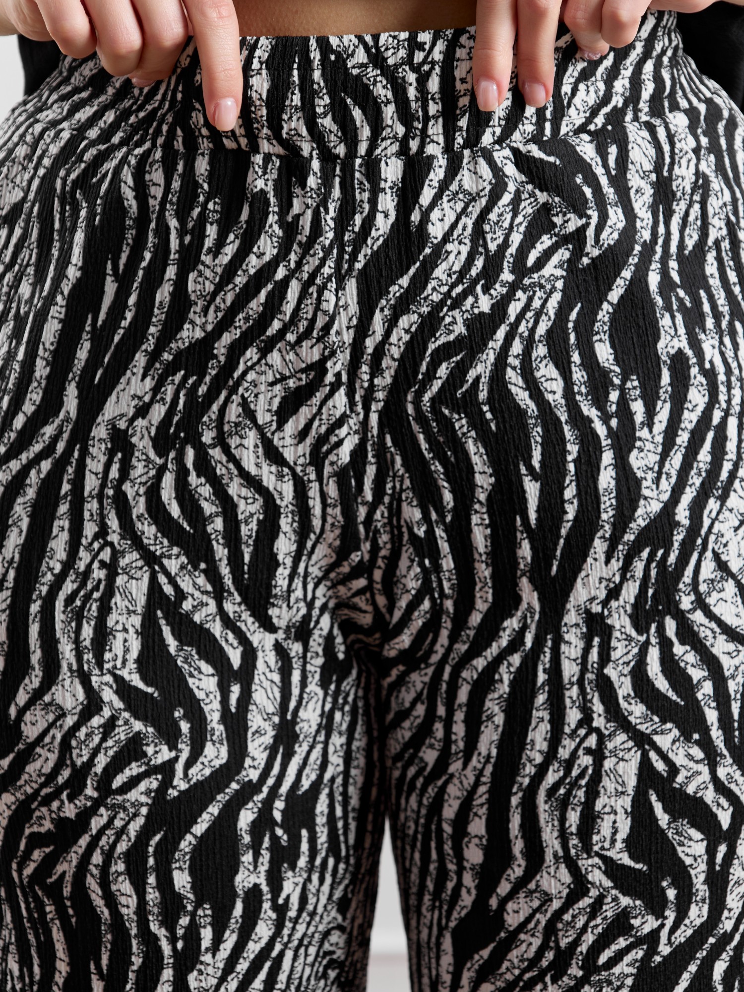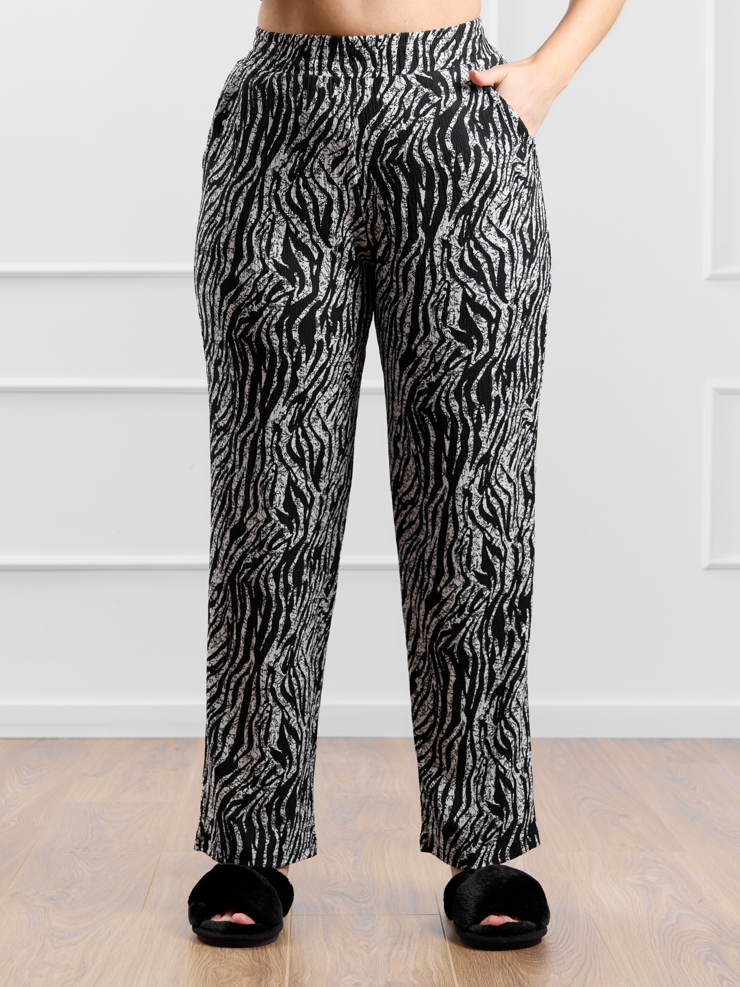 Брюки женские из трикотажного полотна «бурумчук» (шелковый креп) с набивным рисунком, прямого кроя, свободные, с карманами в боковых швах, на притачном поясе с эластичной тесьмой внутри.