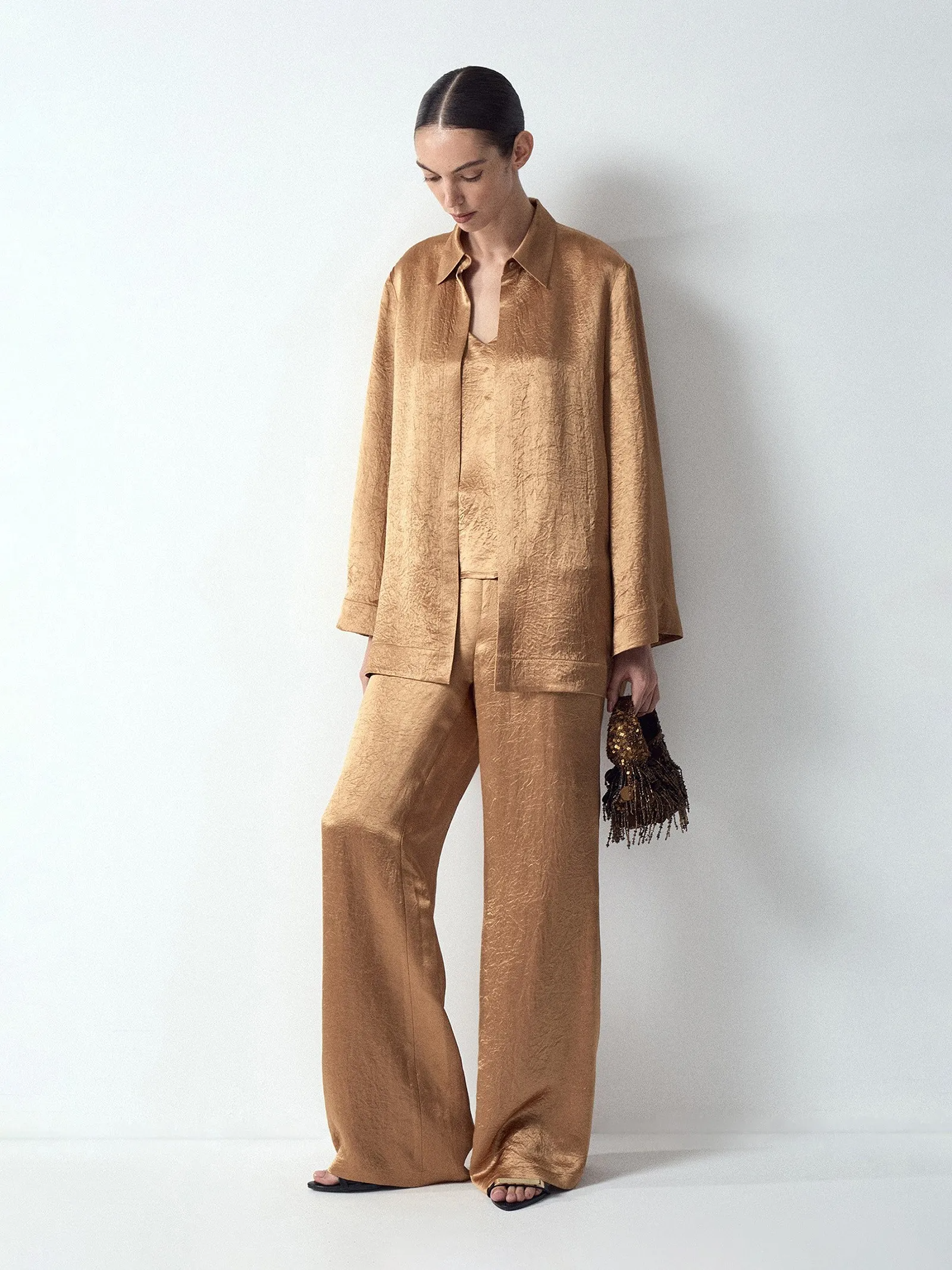 Благородный оттенок старого золота создаст праздничное настроение. С брюками можно составить нарядный total look в модном цвете сезона, дополнив рубашкой и топом из комплекта. Плотная и гладкая ткань из ацетата имеет тактильно интересную фактуру, красиво блестит, не мнется и не электризуется, а также очень приятна к телу. Комфортная модель имеет свободный крой и выполнена на кулиске с завязками: посадку можно регулировать. Нарядные брюки в бельевом стиле будут сочетаться и с нейтральными, и с акцентными вариантами верха.