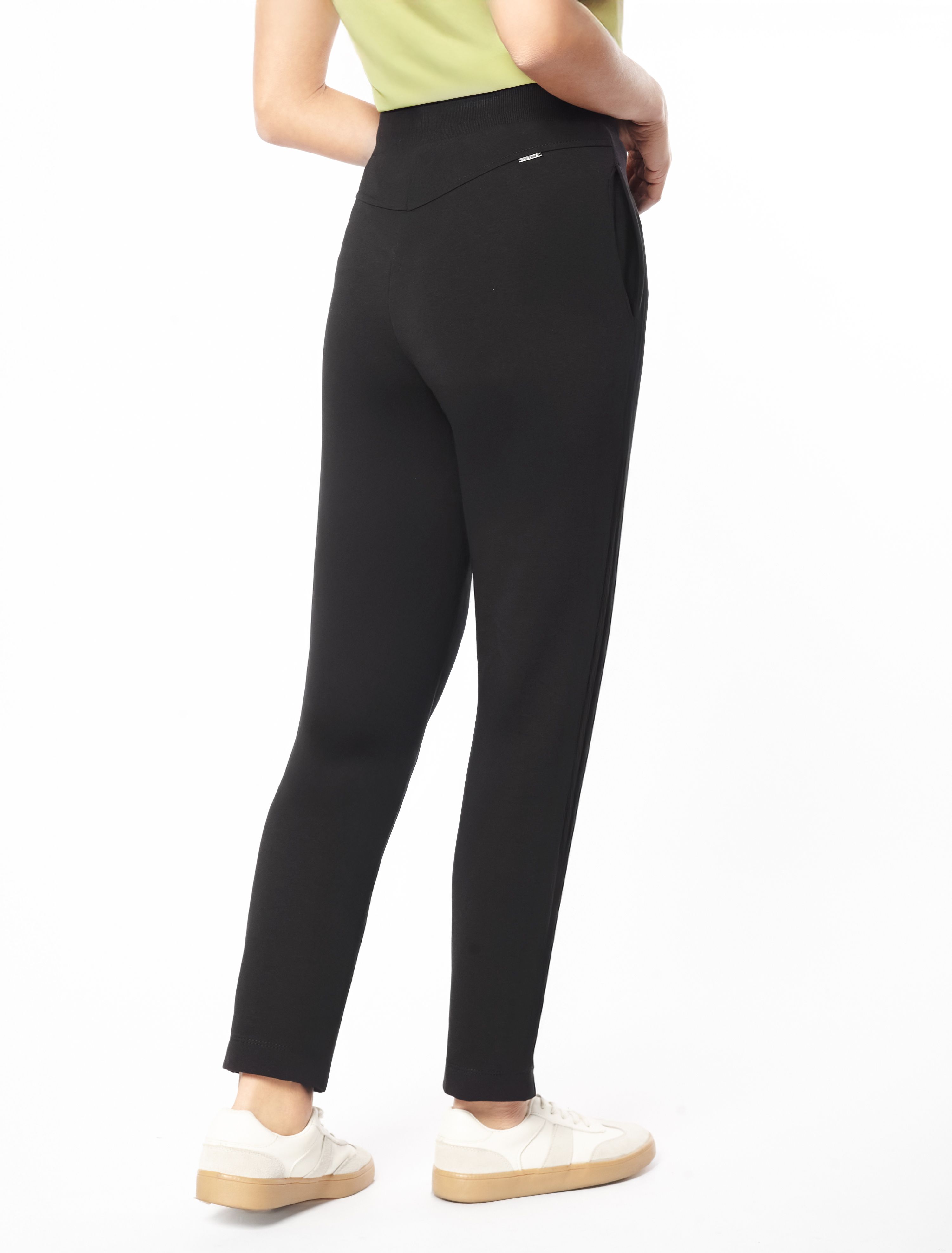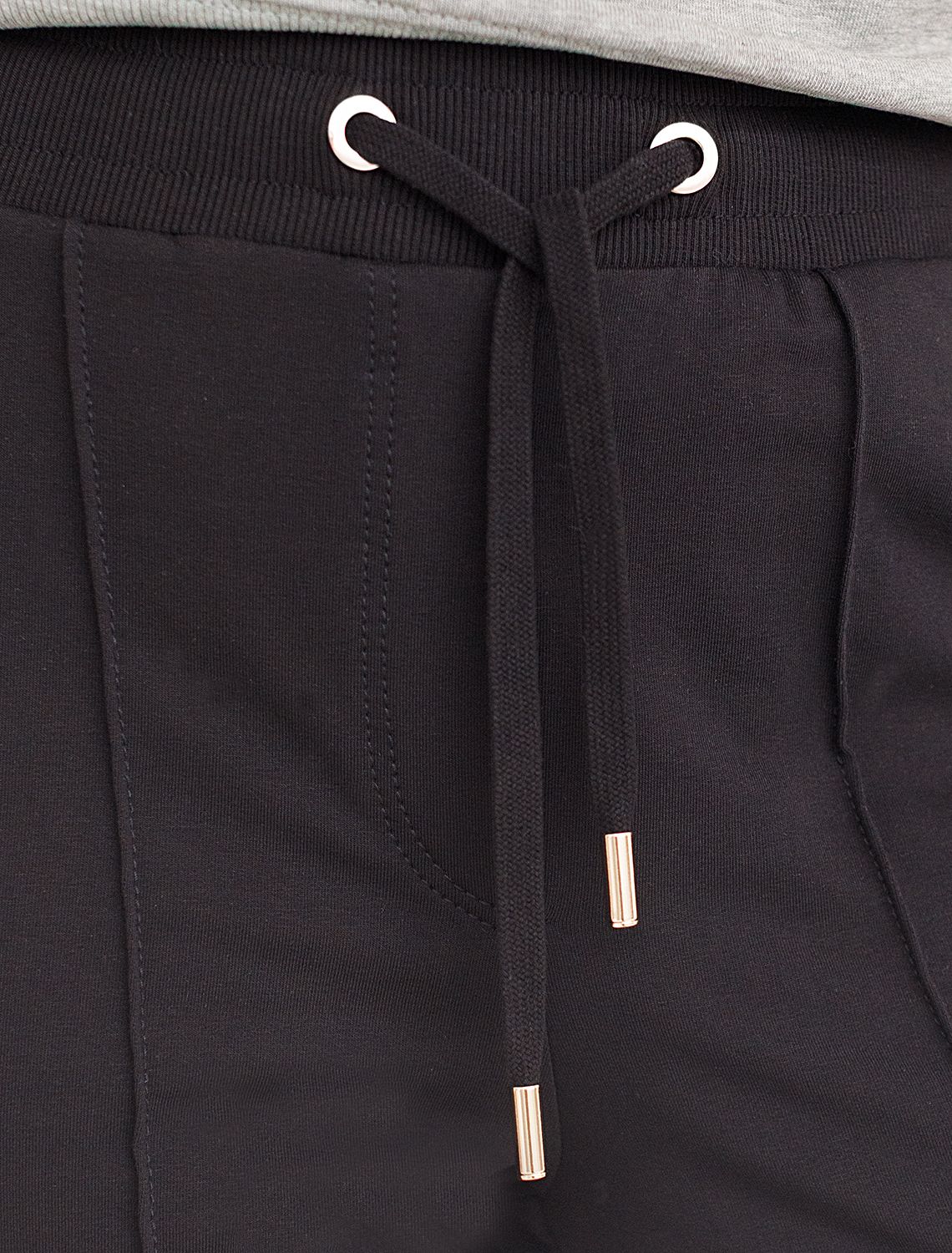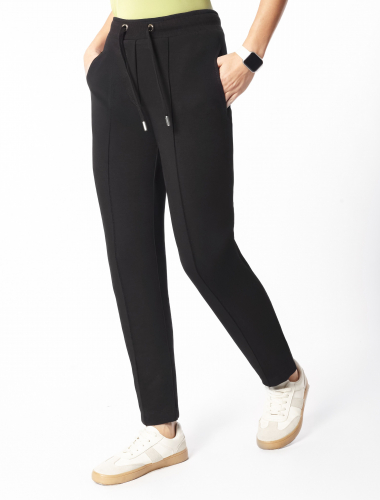 Брюки выполнены из эластичного футера-двухнитки. Модель дополнена застроченными стрелками, что визуально вытягивает силуэт. Эластичный пояс на резинке с хлопковым шнурком и металлической фурнитурой. Брюки сочетаются в костюме с футболкой D49.031 и бомбером D49.038