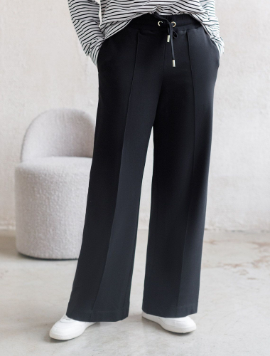 Брюки выполнены из эластичного футера двухнитки. Изделие дополнено боковыми карманами с фирменным логотипом бренда. Пояс на резинке регулируется потайным хлопковым шнурком. Эластан в составе гарантирует комфорт и формоустойчивость. Модель сочетается в костюме с свитшотом D49.072 и паркой D49.076