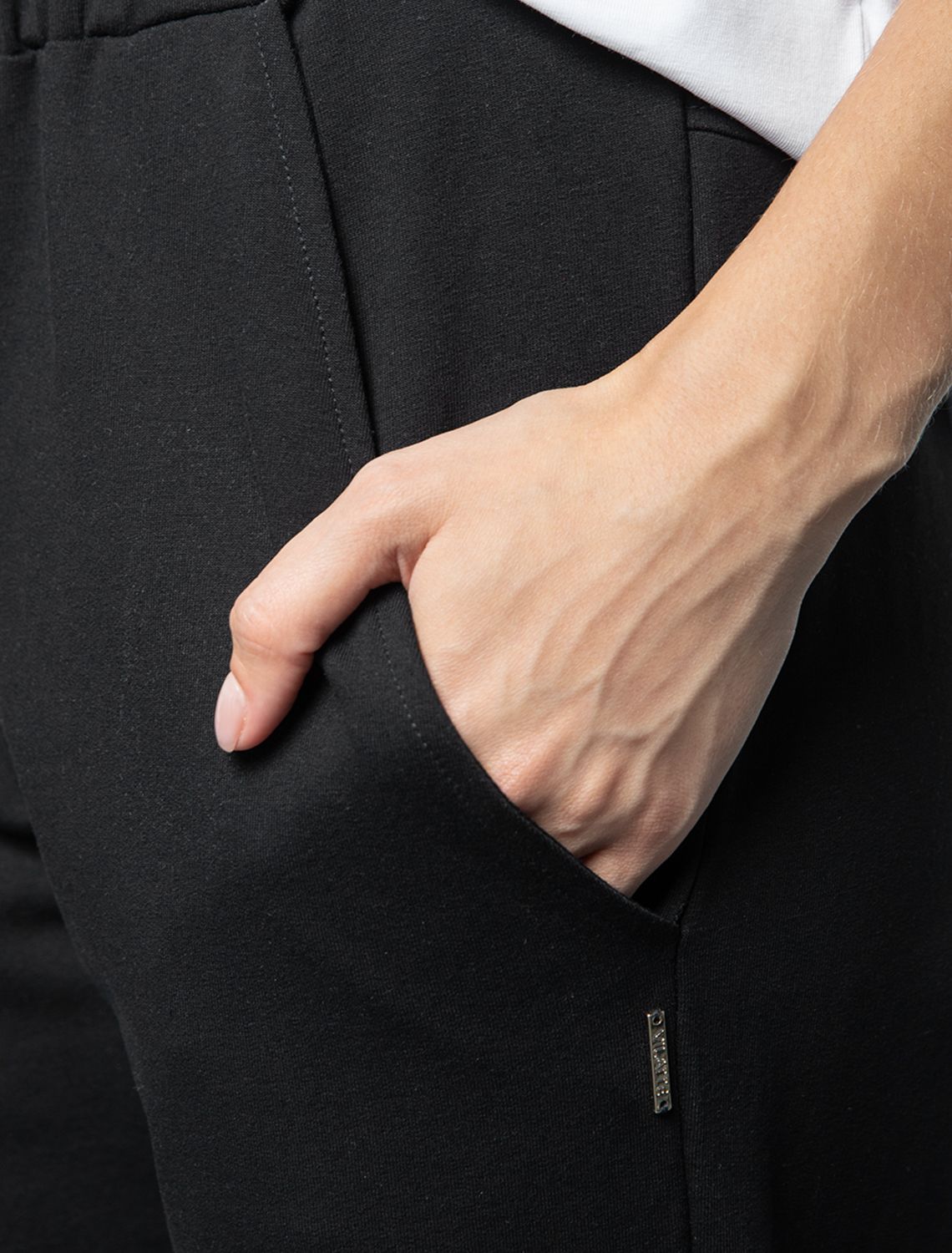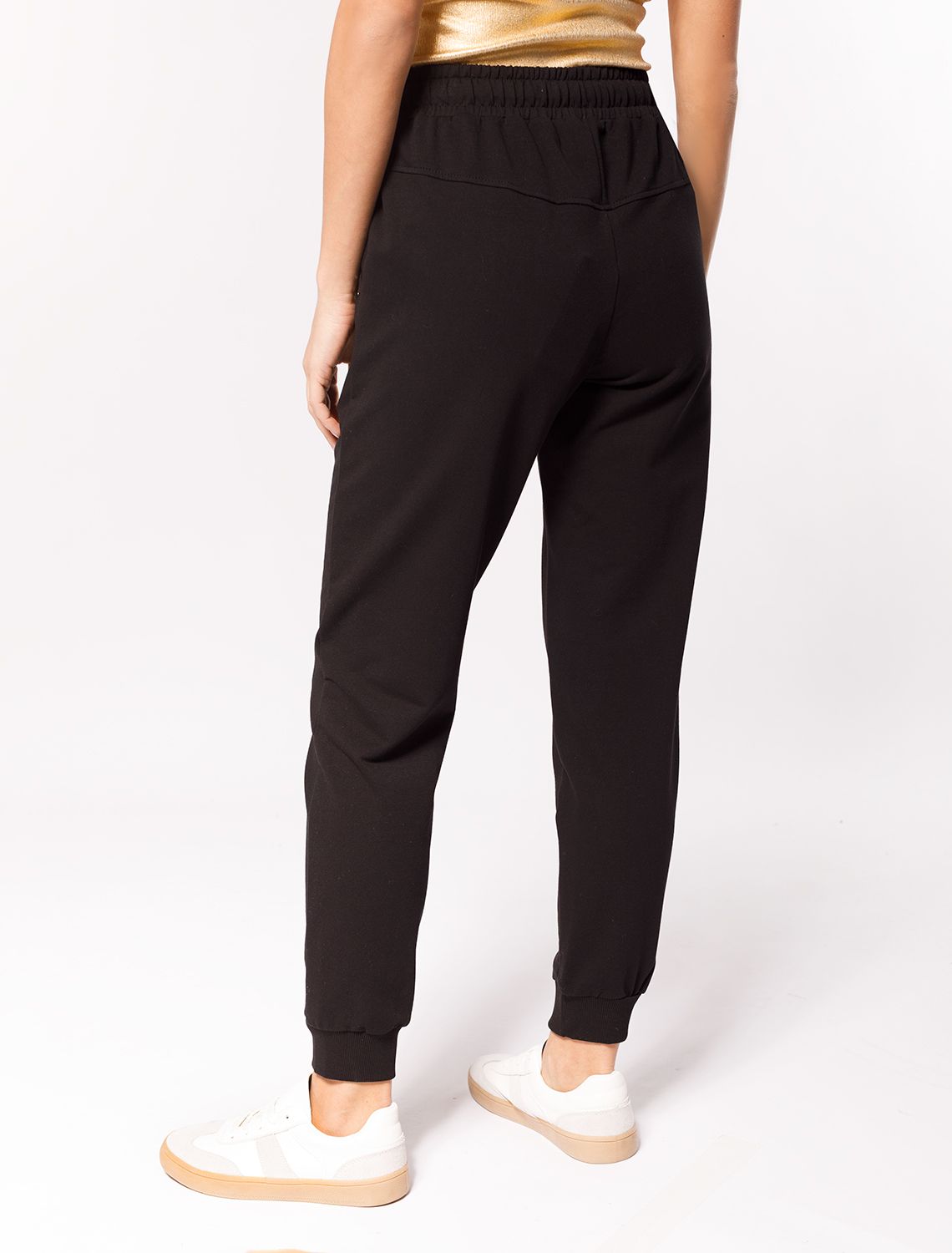Черные брюки джогерры выполнены из эластичного футера двухнитки. Модель дополнена двумя карманами и поясом с регулируемым шнурком. В завершённый образ возьмите свитшот D49.945, D49.948 или свободное худи. черный