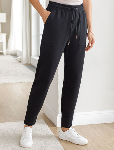 Брюки выполнены из футера двухнитки с эластаном. Модель зауженная к низу дополнена карманами и эластичным поясом с фактурой в рубчик. В пояс вставлен плоский хлопковый шнур в тон изделия с золотистыми наконечниками. Изделие дополнено металлическим логотипом бренда. Сочетается в костюме с жакетом D49.078, джемпером D49.079, D49.080 и футболкой D49.081