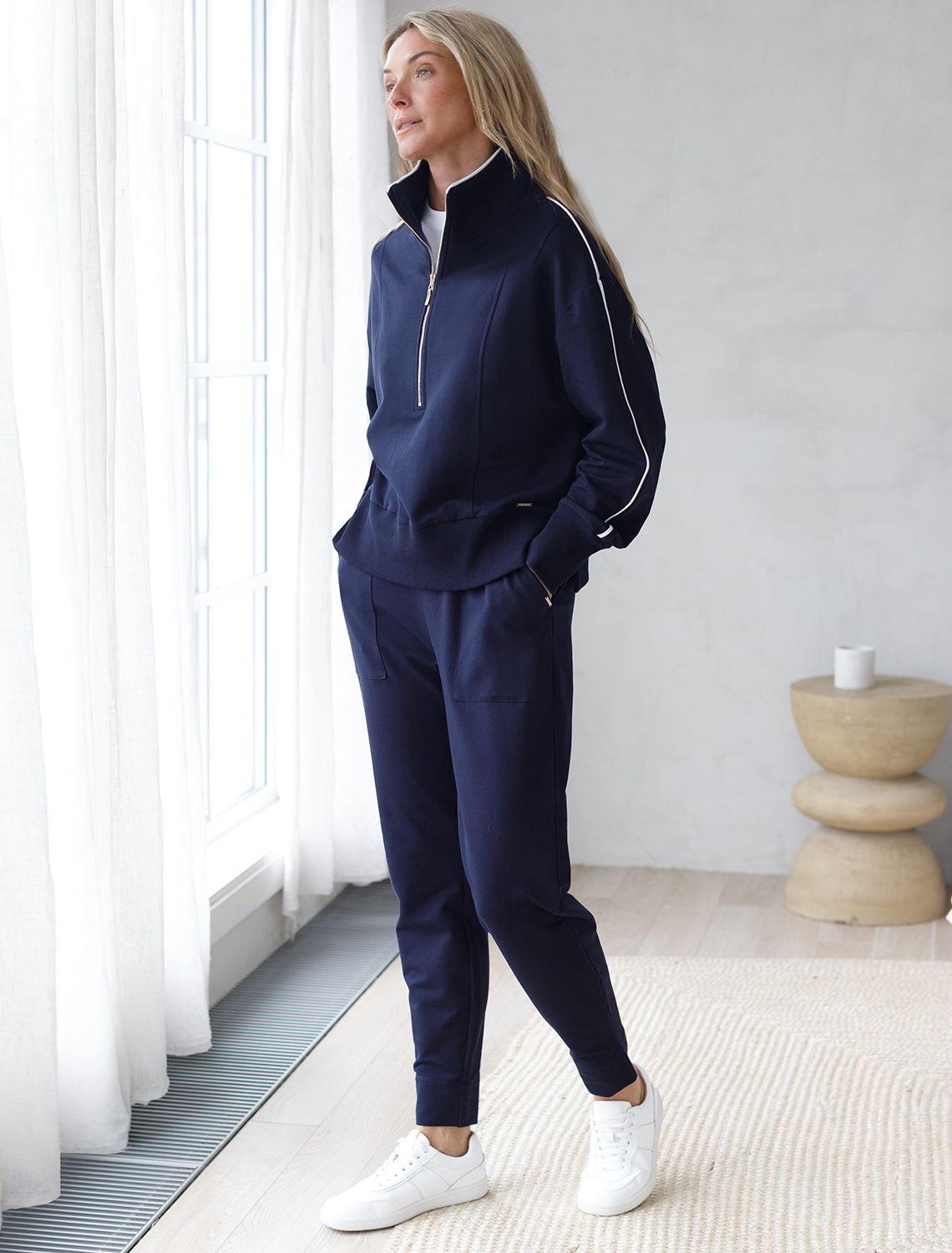 Брюки выполнены из футера двухнитки с эластаном. Модель зауженная к низу дополнена карманами и эластичным поясом с фактурой в рубчик. В пояс вставлен плоский хлопковый шнур в тон изделия с золотистыми наконечниками. Изделие дополнено металлическим логотипом бренда. Сочетается в костюме с жакетом D49.078, джемпером D49.079, D49.080 и футболкой D49.081