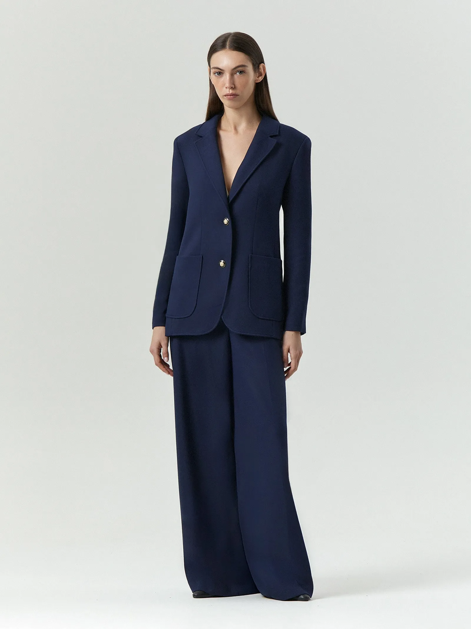 Брюки широкого кроя с посадкой на бёдрах сочетают сдержанность офисного стиля и расслабленность. Материал в насыщенном тёмно-синем цвете с содержанием вискозы на ощупь напоминает плотный трикотаж. Брюки визуально формируют красивую линию бедра. Завершить образ с брюками можно жакетом из комплекта, полосатой рубашкой, воздушным сатиновым топом молочного цвета или тельняшкой. Модель большемерит на один размер.