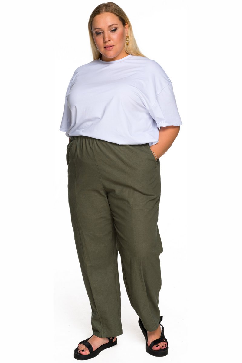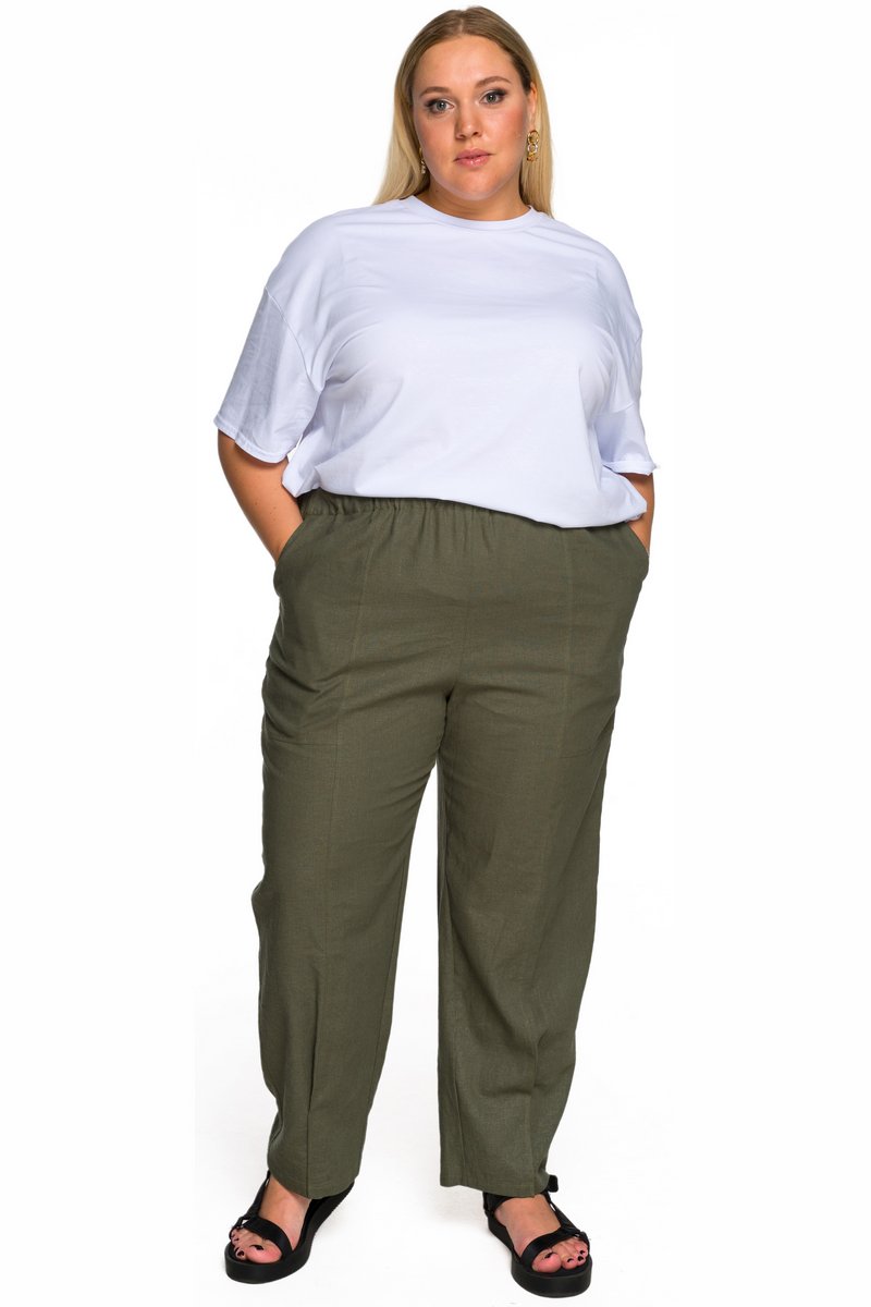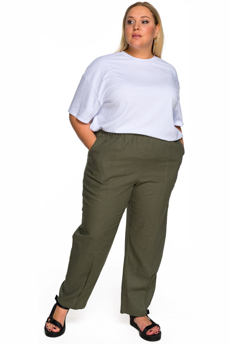 Брюки из льна с карманами, 7/8, цвет хаки