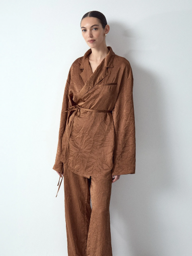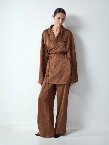 Золотисто-коричневые брюки из гладкого материала с жатым эффектом создадут непринуждённый образ для вечеринки или выходного дня. Застёгиваются на молнию и дополнены завязкой в талии, что позволяет подогнать вещь под свои параметры парой движений. Лучшее сочетание — с кимоно из комплекта.