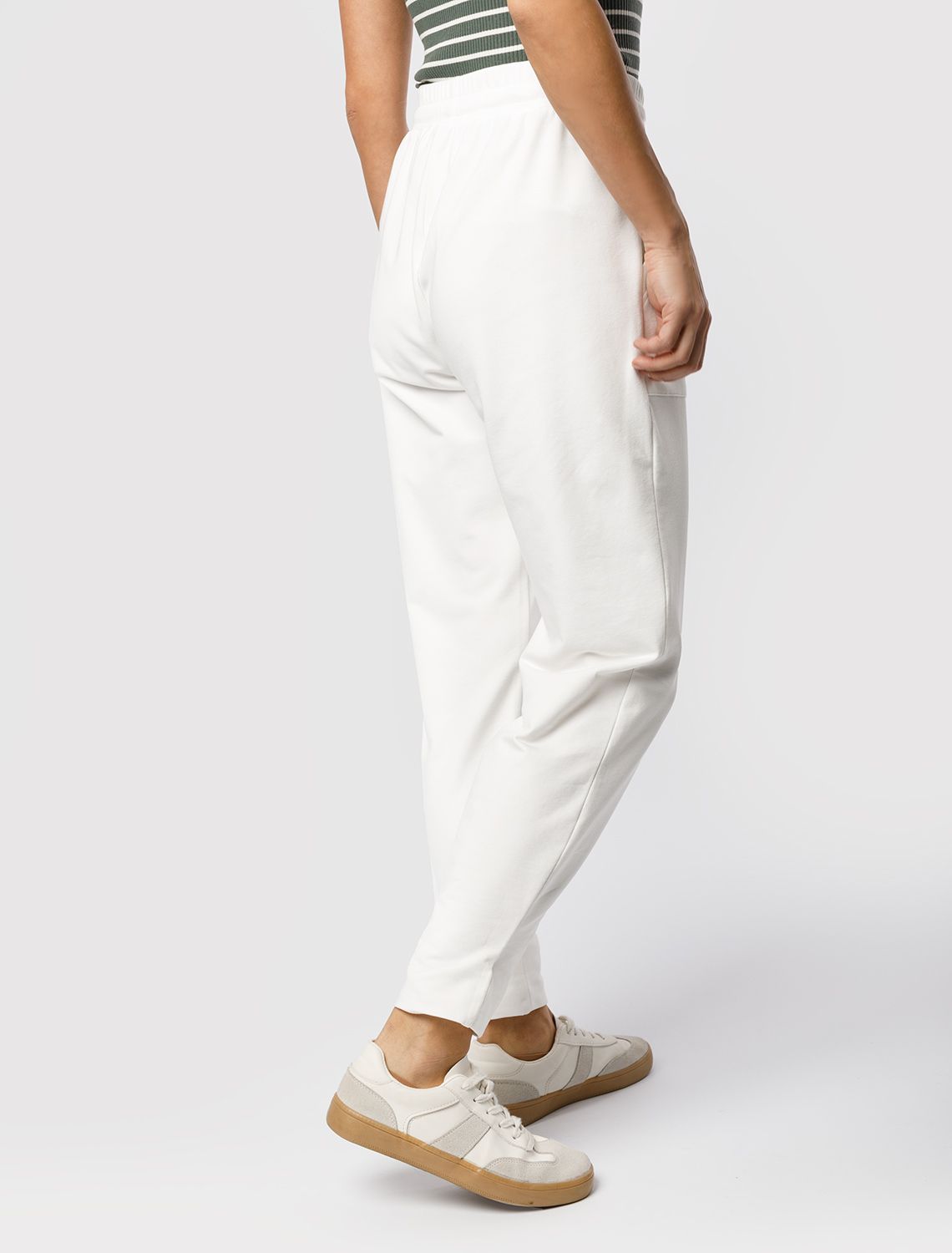 Брюки выполнены из футера двухнитки с эластаном. Модель зауженная к низу дополнена карманами и эластичным поясом с фактурой в рубчик. В пояс вставлен плоский хлопковый шнур в тон изделия с золотистыми наконечниками. Изделие дополнено металлическим логотипом бренда. Сочетается в костюме с жакетом D49.078, джемпером D49.079, D49.080 и футболкой D49.081 молочный