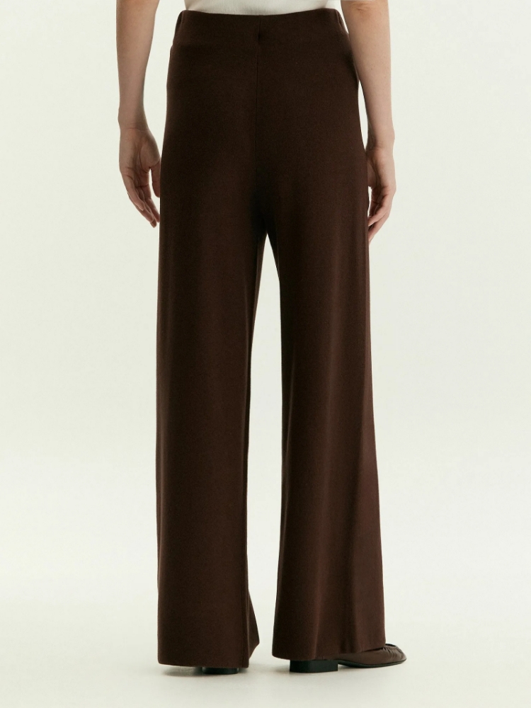 Вещь, которая сочетает в себе максимальный комфорт и элегантность. Трикотажные брюки в шоколадном цвете — идеальный вариант низа на каждый день. Незаменимы в демисезонных и зимних капсулах. Прямая и слегка подстреленная модель смотрится очень актуально. Высокая посадка при эластичном поясе — стильное и комфортное решение. Брюки не стесняют движений, удобно и красиво садятся по фигуре. Мягкий трикотаж плотной вязки сделан из вискозы с эластаном. Брюки удачно завершат образ с топом из комплекта или другим базовым трикотажем