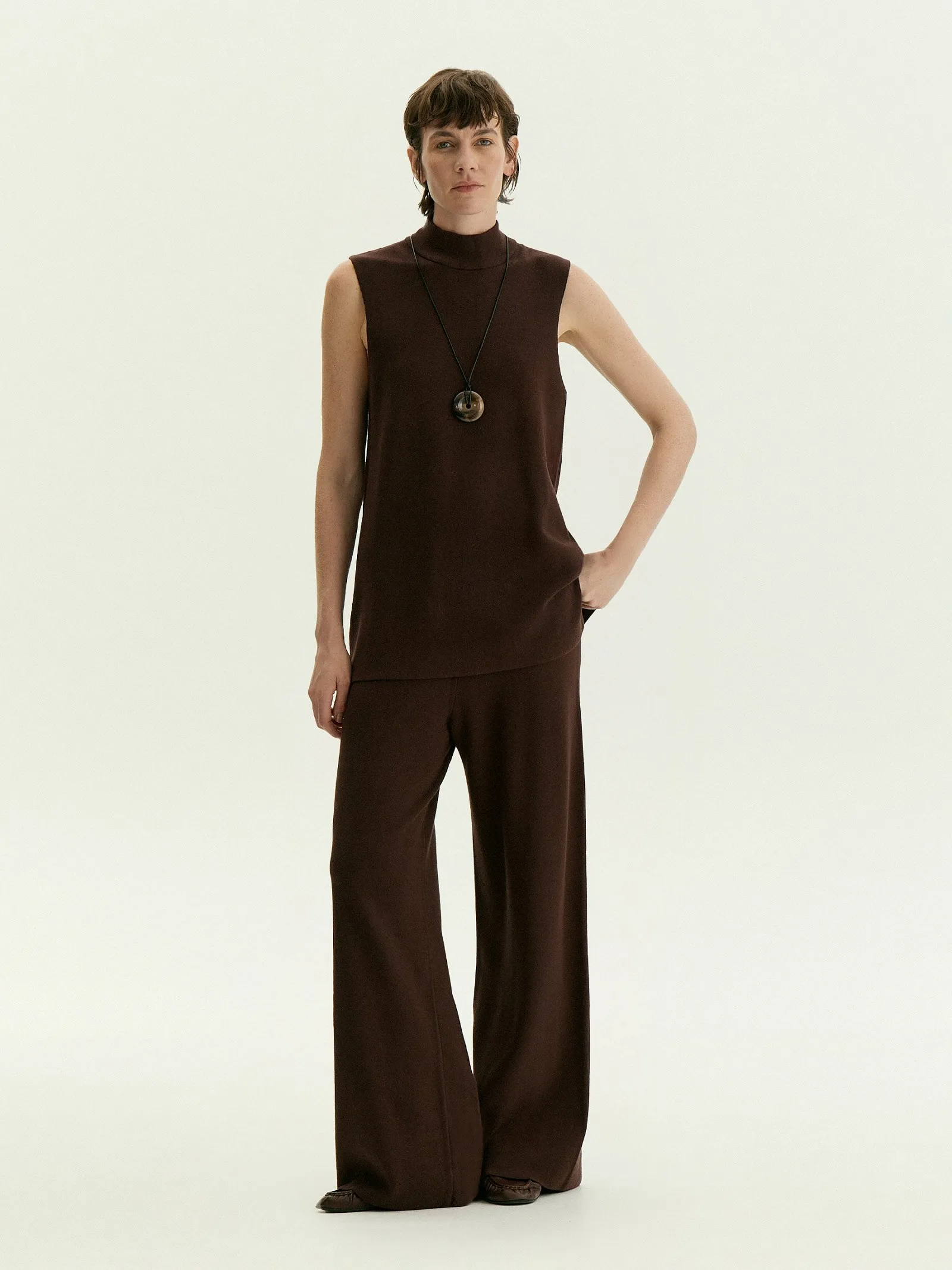 Вещь, которая сочетает в себе максимальный комфорт и элегантность. Трикотажные брюки в шоколадном цвете — идеальный вариант низа на каждый день. Незаменимы в демисезонных и зимних капсулах. Прямая и слегка подстреленная модель смотрится очень актуально. Высокая посадка при эластичном поясе — стильное и комфортное решение. Брюки не стесняют движений, удобно и красиво садятся по фигуре. Мягкий трикотаж плотной вязки сделан из вискозы с эластаном. Брюки удачно завершат образ с топом из комплекта или другим базовым трикотажем.