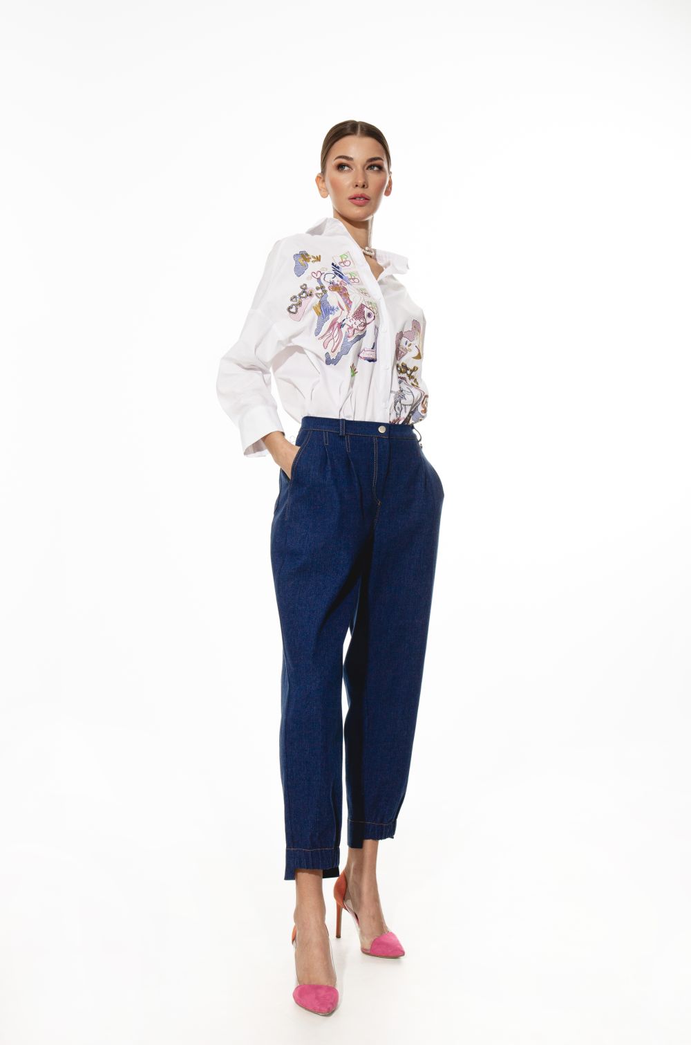 Брюки женские полуприлегающего силуэта, слегка зауженные к низу. По переду карманы с наклонным входом. Пояс притачной, по спинке пояса резинка, слева на шлевке расположен декор в виде металлического украшения. Застежка обработана на кнопку и молнию. Сзади расположены накладные карманы, на правом металлическое украшение.  Брюки отстрочены отделочными строчками. По низу брюки асимметричны, перед  короче. Манжета передней части на резинке.