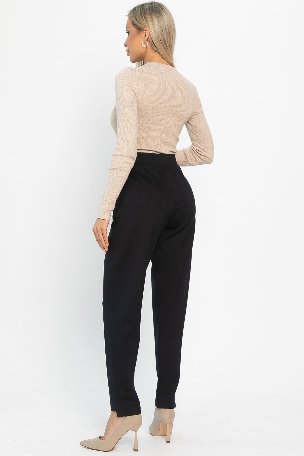 Классические брюки из плотного трикотажа станут отличным дополнением к вашему гардеробу. Брюки прямые, слегка заужены к низу. В боковых швах карманы, край входа в карман декорирован стразами. По низу брюк по боковому декоративная деталь-вставка со стразами. Эти брюки можно носить как на работу, так и на прогулку или встречу с друзьями.