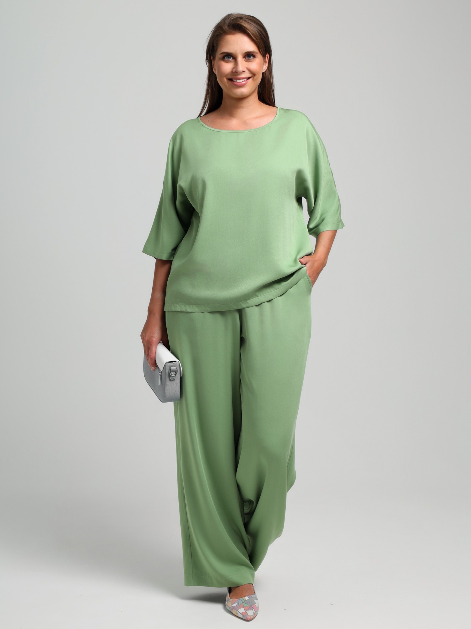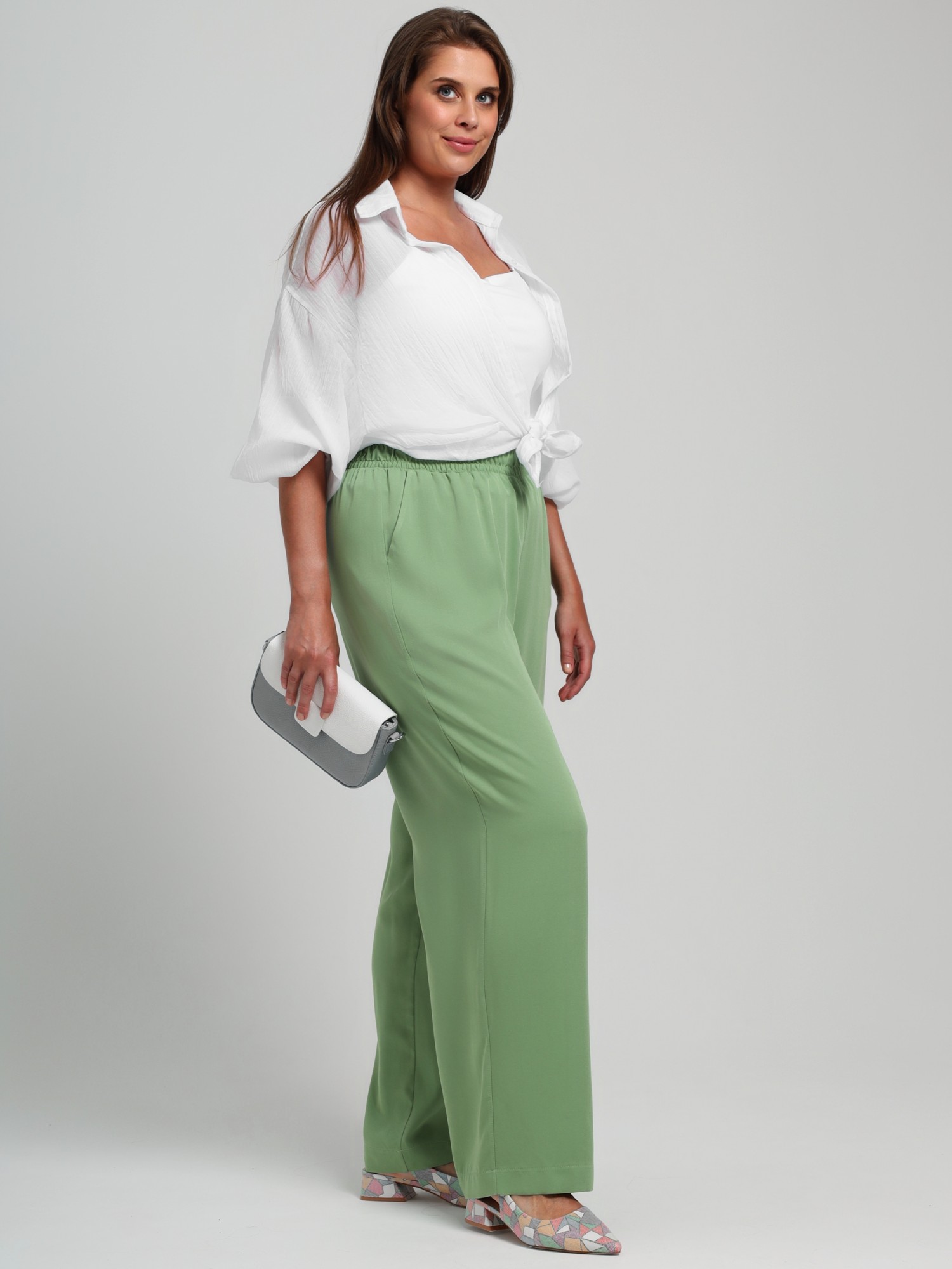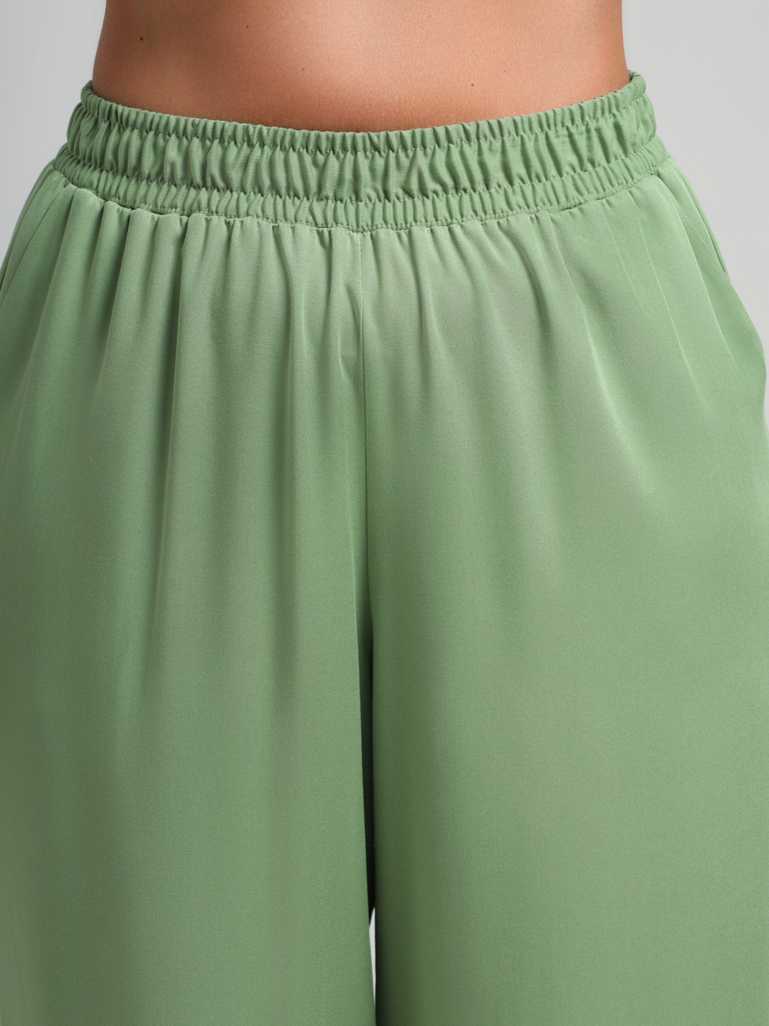 Брюки женские из гладкокрашеного тканого штапельного полотна, свободного покроя, удлиненные, с карманами в бокавых швах, на притачном поясе с эластичной тесьмой внутри.