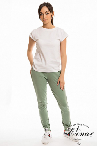 Спортивные брюки из футер петли с лайкрой. Зауженный покрой к низу, пояс на резинке, по бокам расположены карманы. Через петли в поясе продернут шнур. На передних частях манжет расположены нашивки.