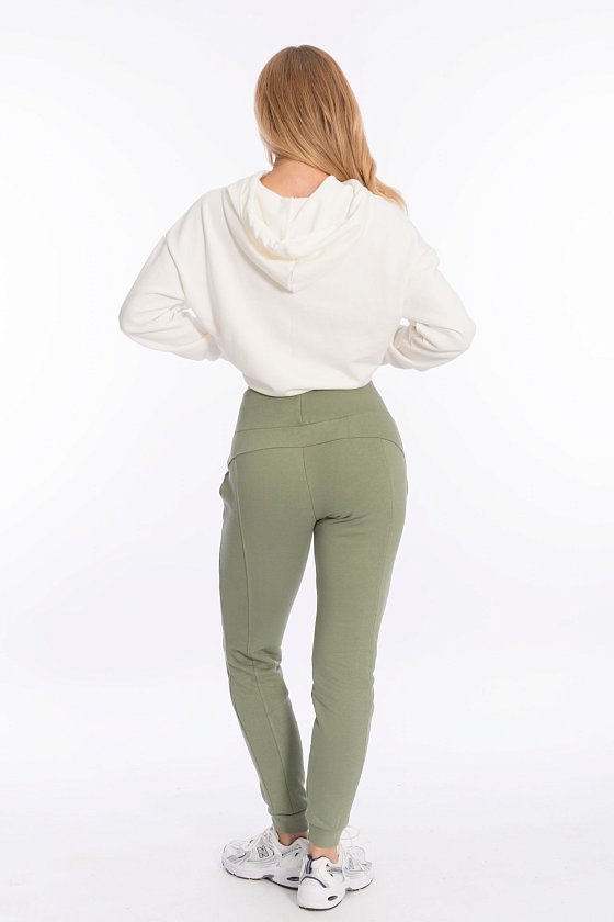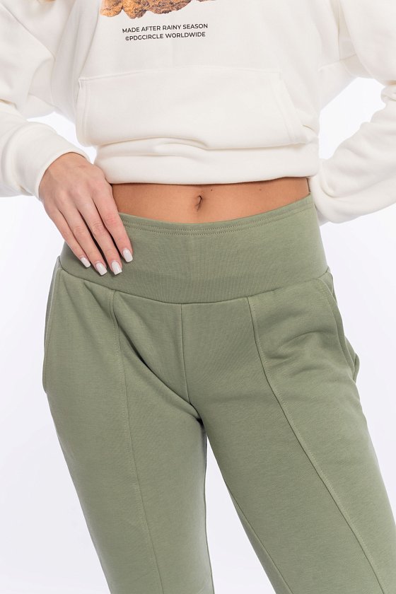 Брюки из однотонного футера трёхнитка воздушка. Брюки с широким поясом с резиной внутри и притачными манжетами по низу. По бокам размещены карманы.