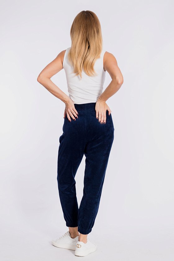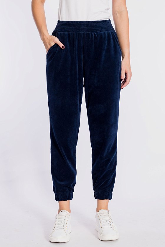 Женские брюки выполнены из однотонного велюра. С боковыми карманами, притачным поясом и сборкой на резинку внизу.