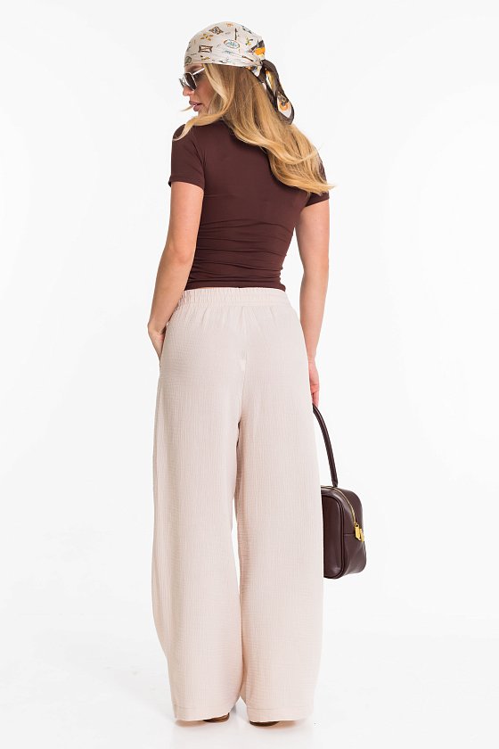 Женские брюки свободного силуэта из муслина. Спереди настрочены карманы, пояс на резине.