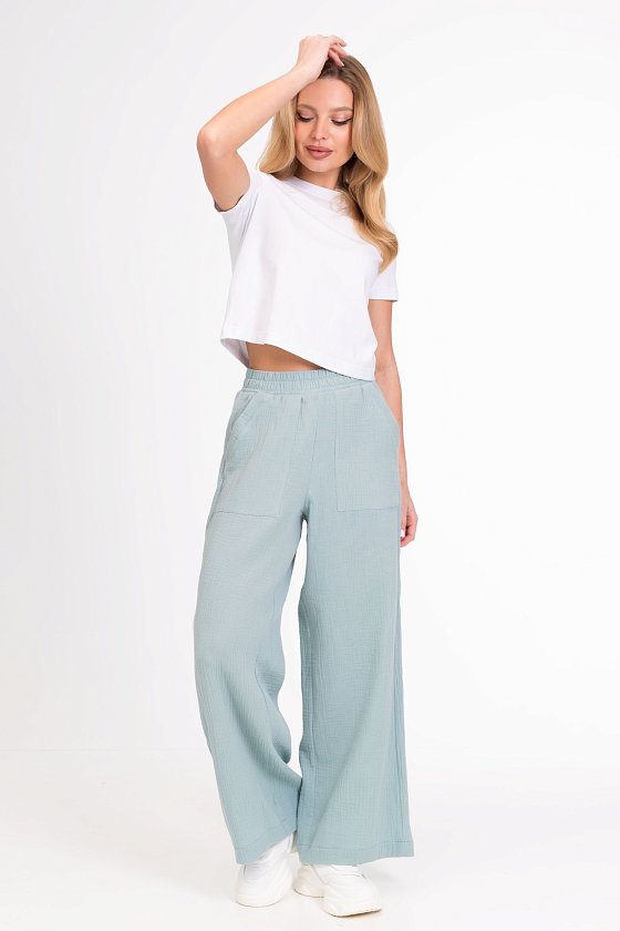 Женские брюки свободного силуэта из муслина. Спереди настрочены карманы, пояс на резине.
