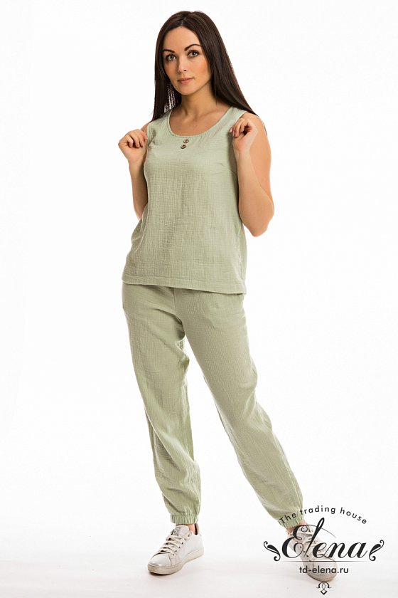 Женские брюки выполнены из однотонного муслина. Пояс притачной на резине и шнуре, по бокам размещены карманы. Низ брюк собран на резинку.