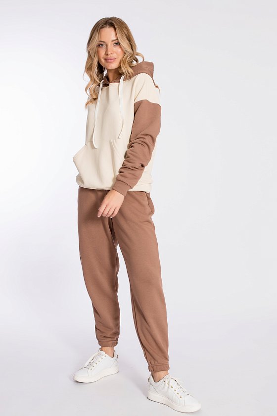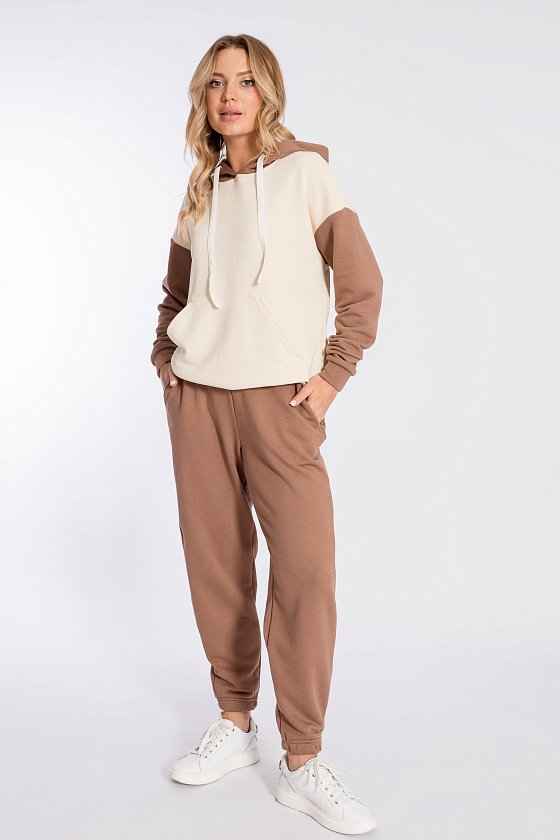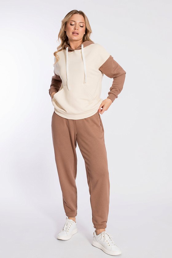 Брюки выполнены из однотонного футера трёхнитки (воздушка), с притачным поясом и резинкой по низу. По бокам размещены карманы.
