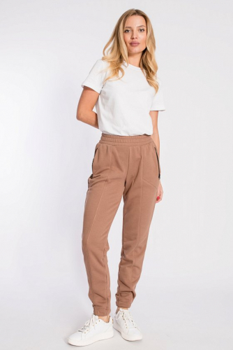 Женские брюки выполнены из однотонного футера трёхнитки (воздушка). Пояс и низ брюк на резине. Брюки дополнены двумя боковыми карманами с застёжкой на молнию.