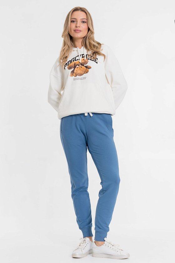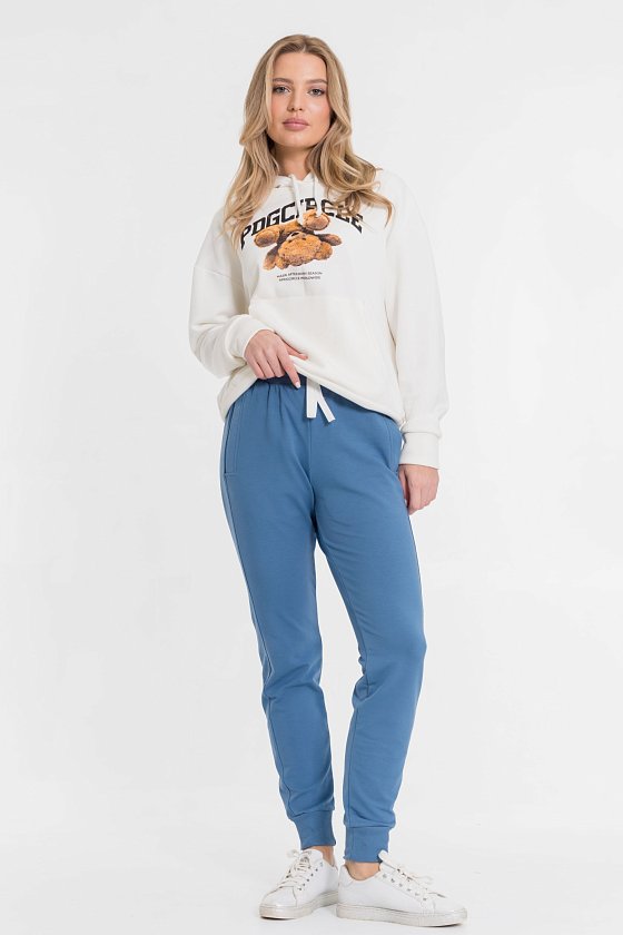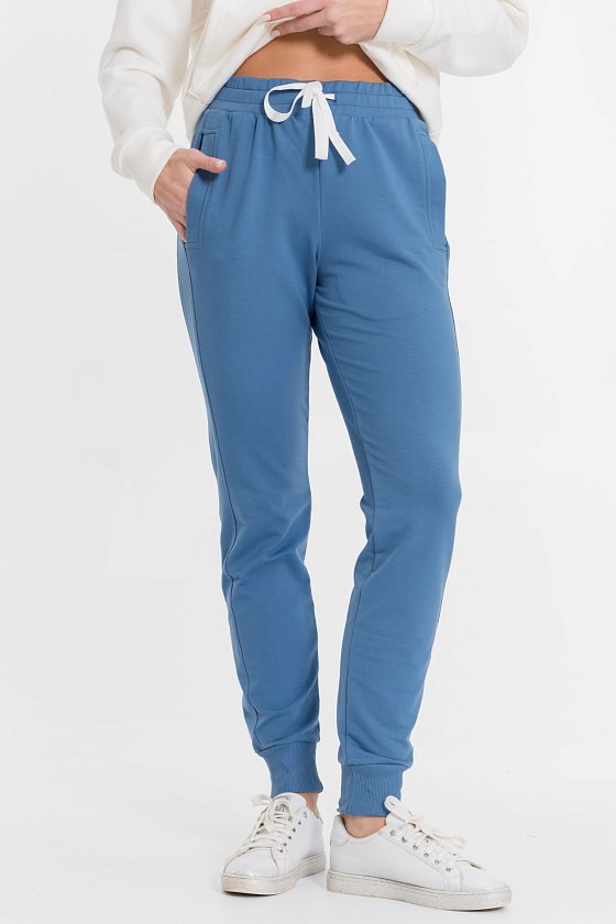 Брюки выполнены из однотонной футер петли с лайкрой. Для комфортной посадки в пояс брюк вставлены резина и шнур. По бокам размещены карманы. Низ брюк с манжетами из кашкорсе.
