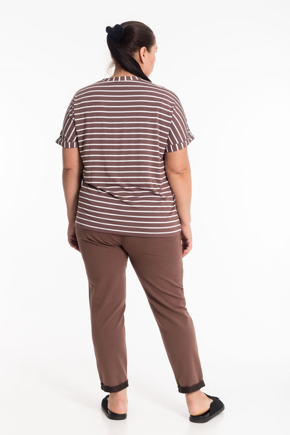Однотонные коричневые брюки из футера с лайкрой — отличный выбор для повседневной носки. Пояс на резинке обеспечивает удобную посадку, а боковые карманы и отвороты внизу делают модель стильной и практичной. Брюки из футера идеально подойдут для активного отдыха или прогулок. Хлопок 72% Полиэстер 20% Лайкра 8%