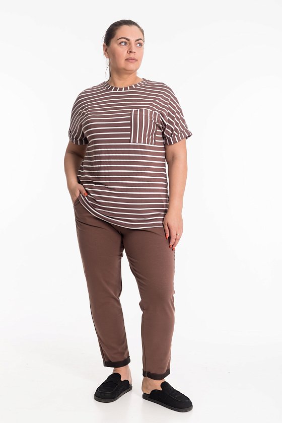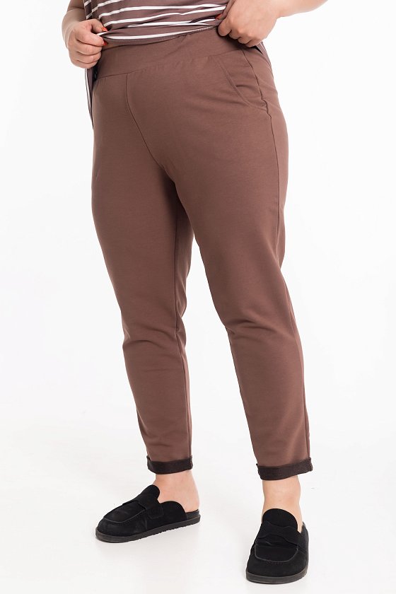 Однотонные коричневые брюки из футера с лайкрой — отличный выбор для повседневной носки. Пояс на резинке обеспечивает удобную посадку, а боковые карманы и отвороты внизу делают модель стильной и практичной. Брюки из футера идеально подойдут для активного отдыха или прогулок.