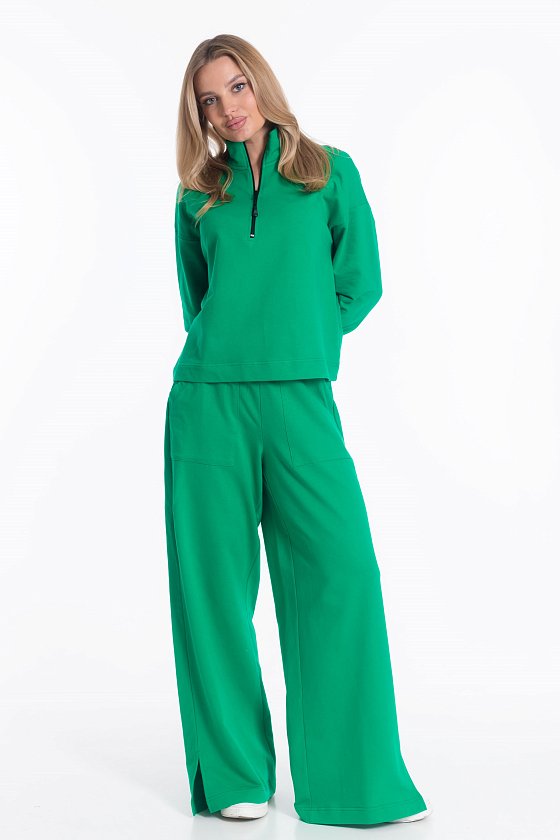 Женские зеленые брюки свободного силуэта из облегченного футера 2х нитки — отличный выбор для повседневной носки. Однотонный дизайн и пояс на резинке гарантируют комфортную посадку. Передние карманы и боковые разрезы добавляют модели практичность. Брюки идеально подойдут для активного отдыха или прогулок.