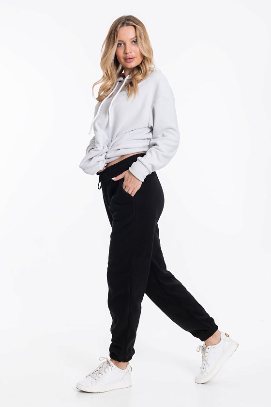 Женские чёрные брюки из флиса — отличный выбор для повседневной носки. Боковые карманы и пояс на резинке со шнуром обеспечивают комфортную посадку, а низ штанин на резинке хорошо садится по фигуре. Брюки сохраняют тепло и подходят для активного отдыха.