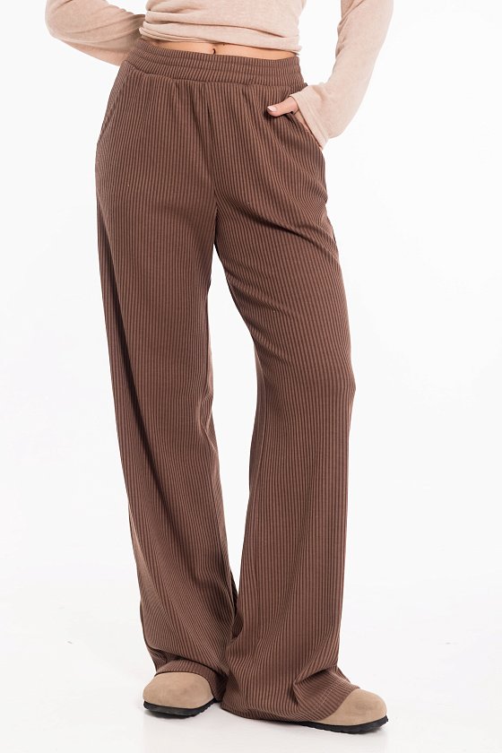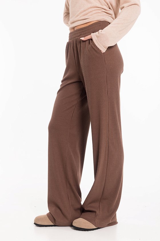 Женские брюки выполнены из однотонного синтетического полотна "лапша". Силуэт свободный, пояс на резинке, по бокам размещены карманы.