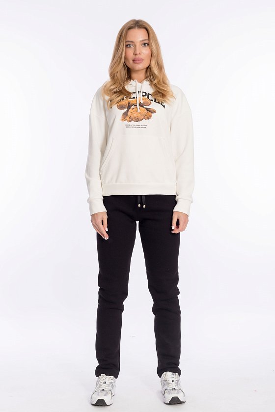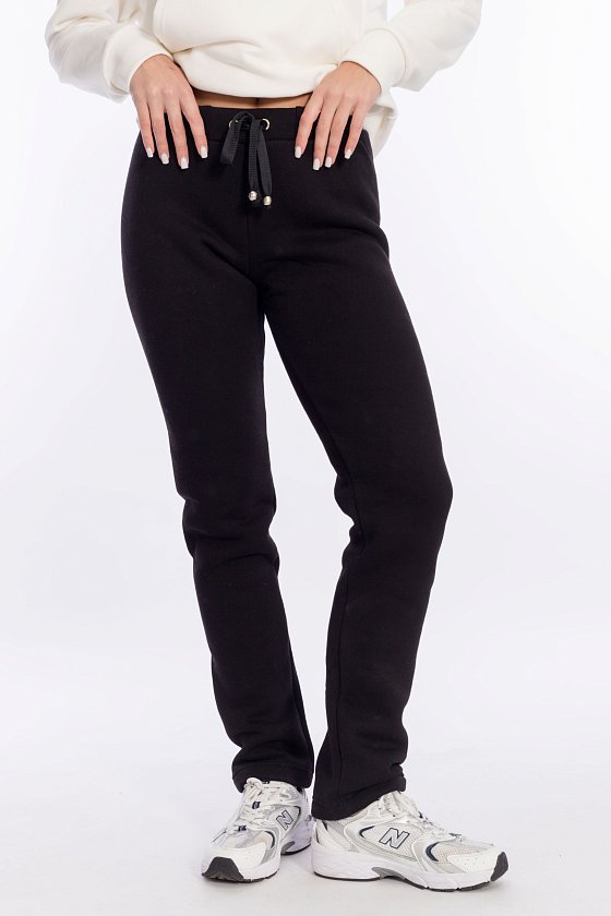 Тёплые спортивные брюки пригодятся для прогулок в холодное время года. Брюки выполнены из полотна с начёсом. Посадка стандартная, на талии, в пояс вставлена резина. Спереди пояс с люверсами, через которые проложен шнур.