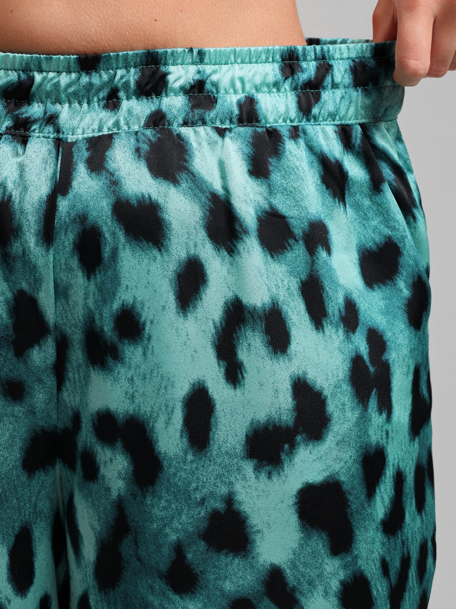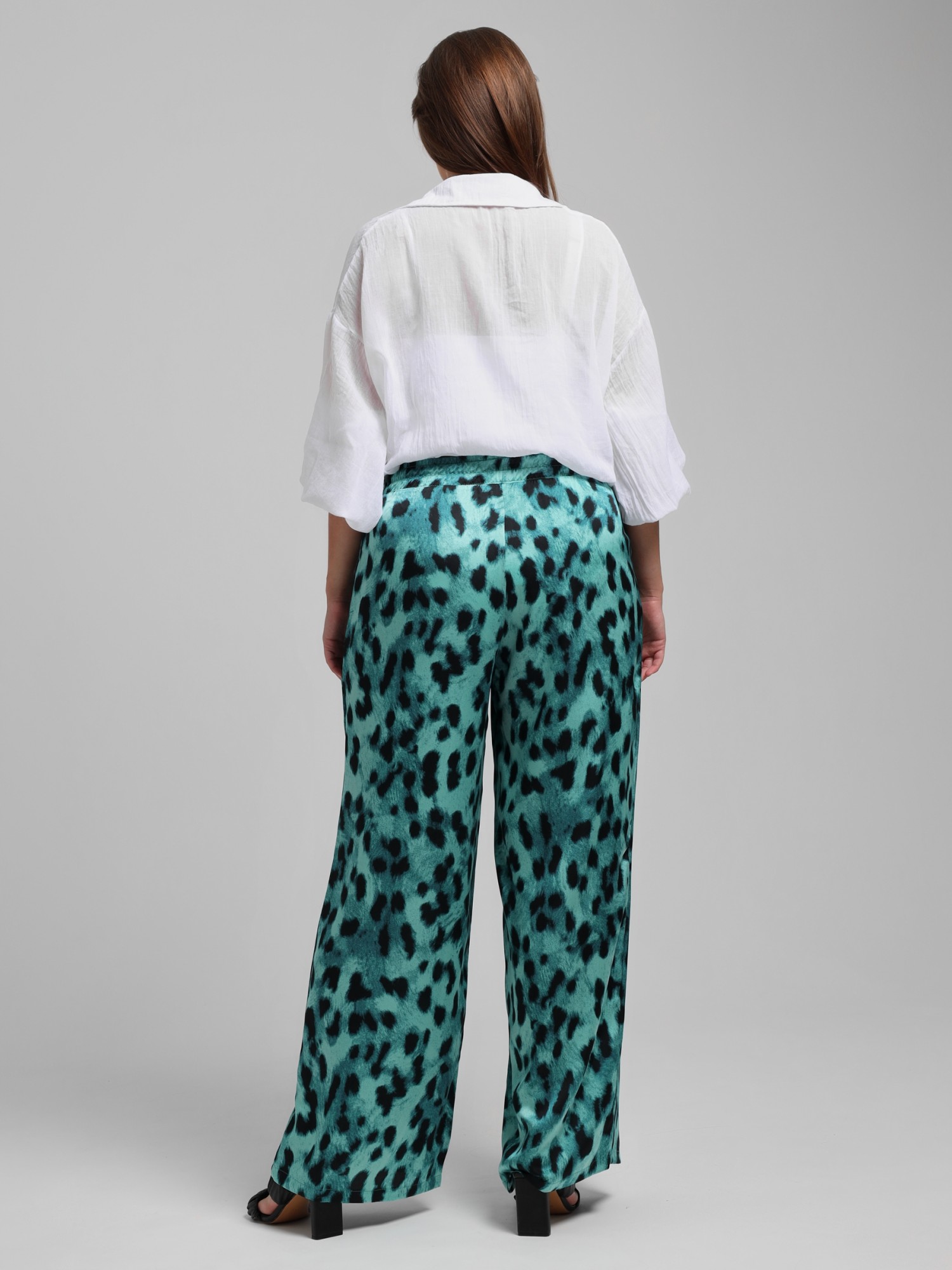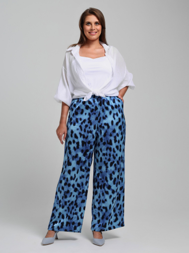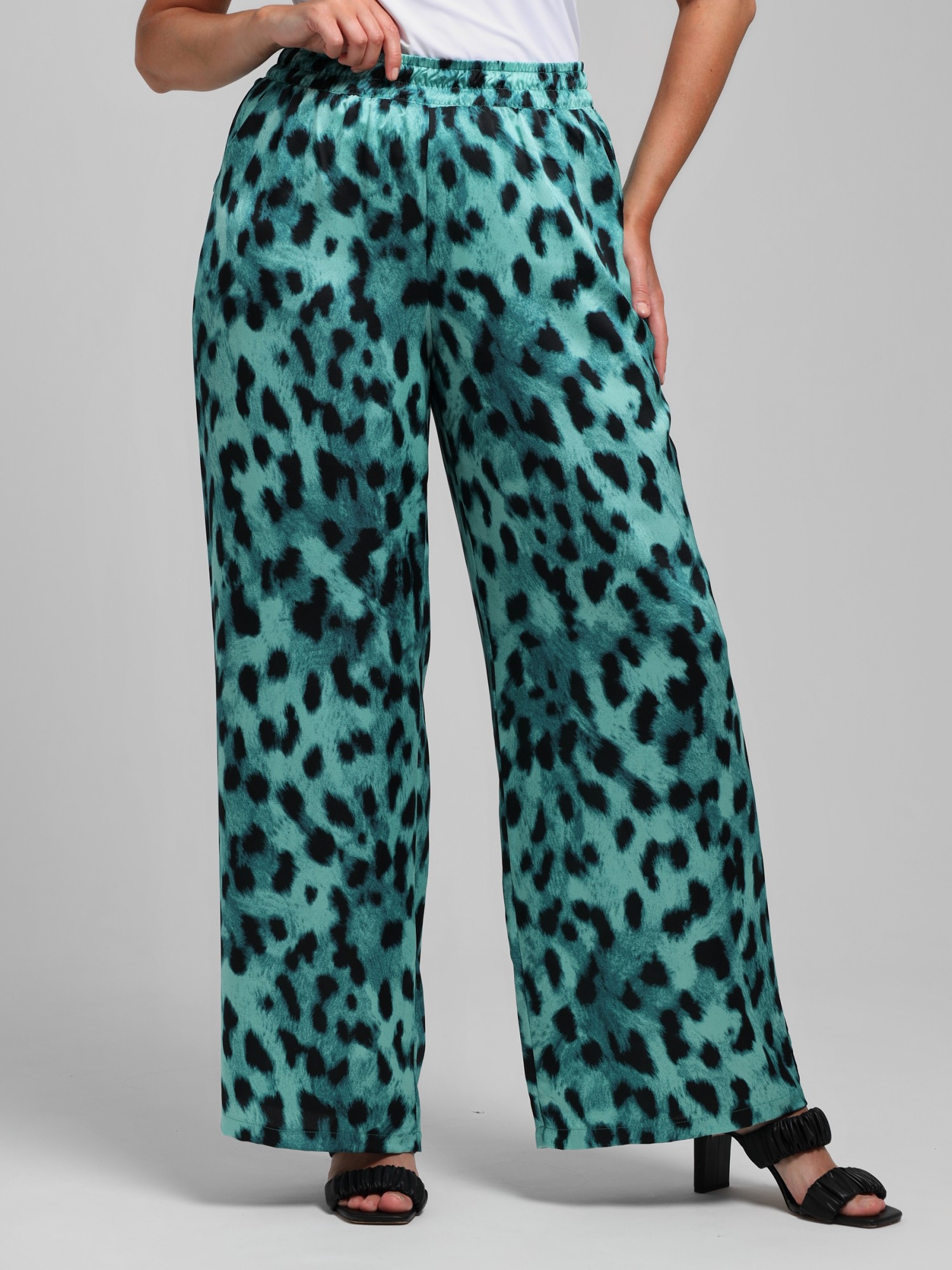 Брюки женские из тканого полотна «искусственный шёлк полиэстер» с набивным рисунком, длинные, свободные, с карманами в боковых швах, на притачном поясе с эластичной тесьмой внутри.