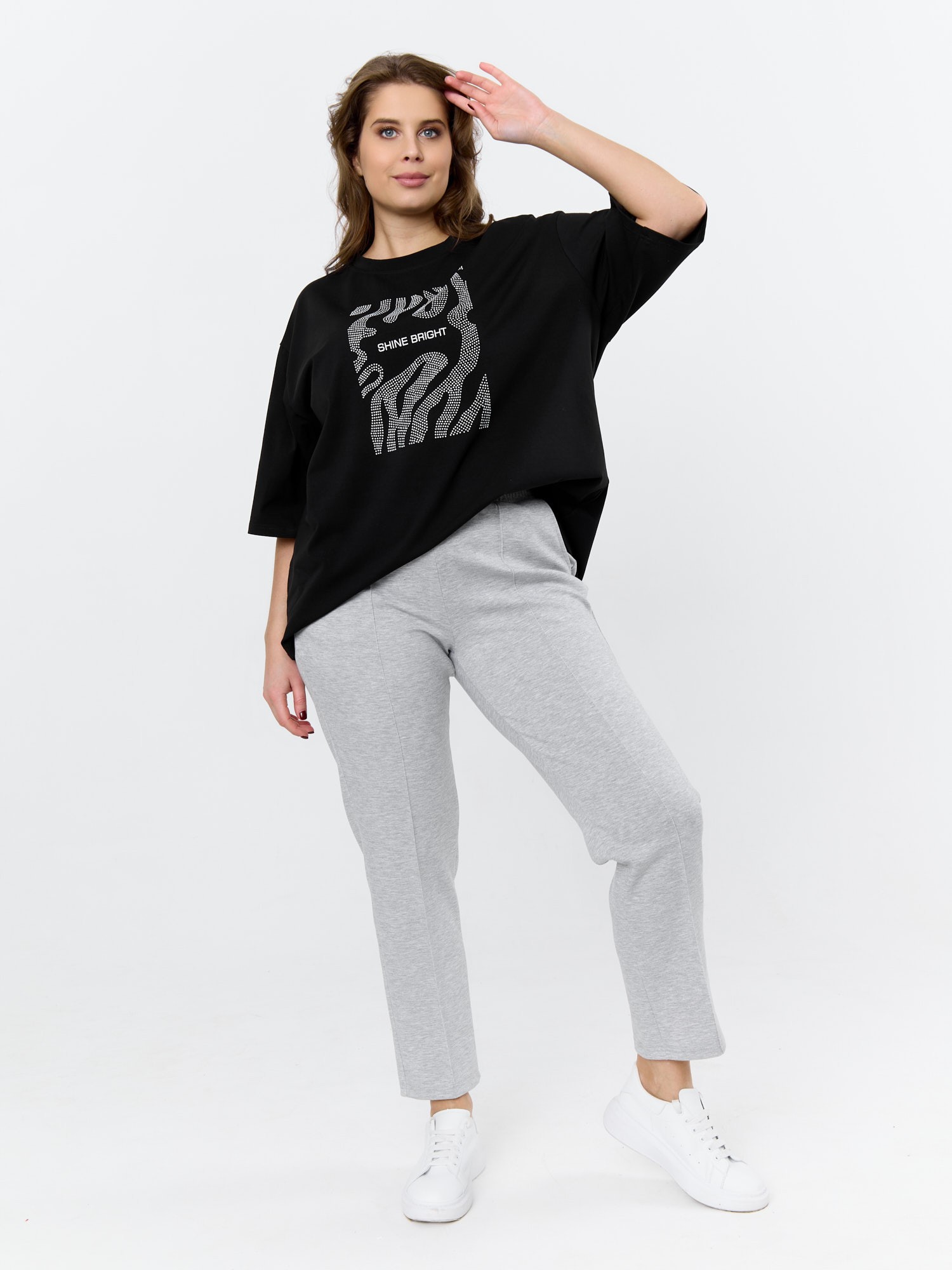 Брюки женские из трикотажного гладкокрашенного полотна «скуба», длинные, полуприлегающего силуэта, на притачном поясе с эластичной тесьмой внутри и карманами в боковых швах. Передние половины застрочены по центральным линиям, на задних половинах обработаны две вытачки в области талии.