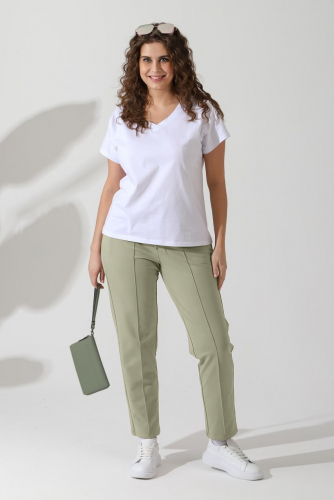 Брюки женские из трикотажного полотна «футер-двунитка», длинные, полуприлегающего силуэта, на притачном поясе с эластичной тесьмой внутри и карманами в боковых швах. Передние половины застрочены по центральным линиям, на задних половинах обработаны две вытачки в области талии.