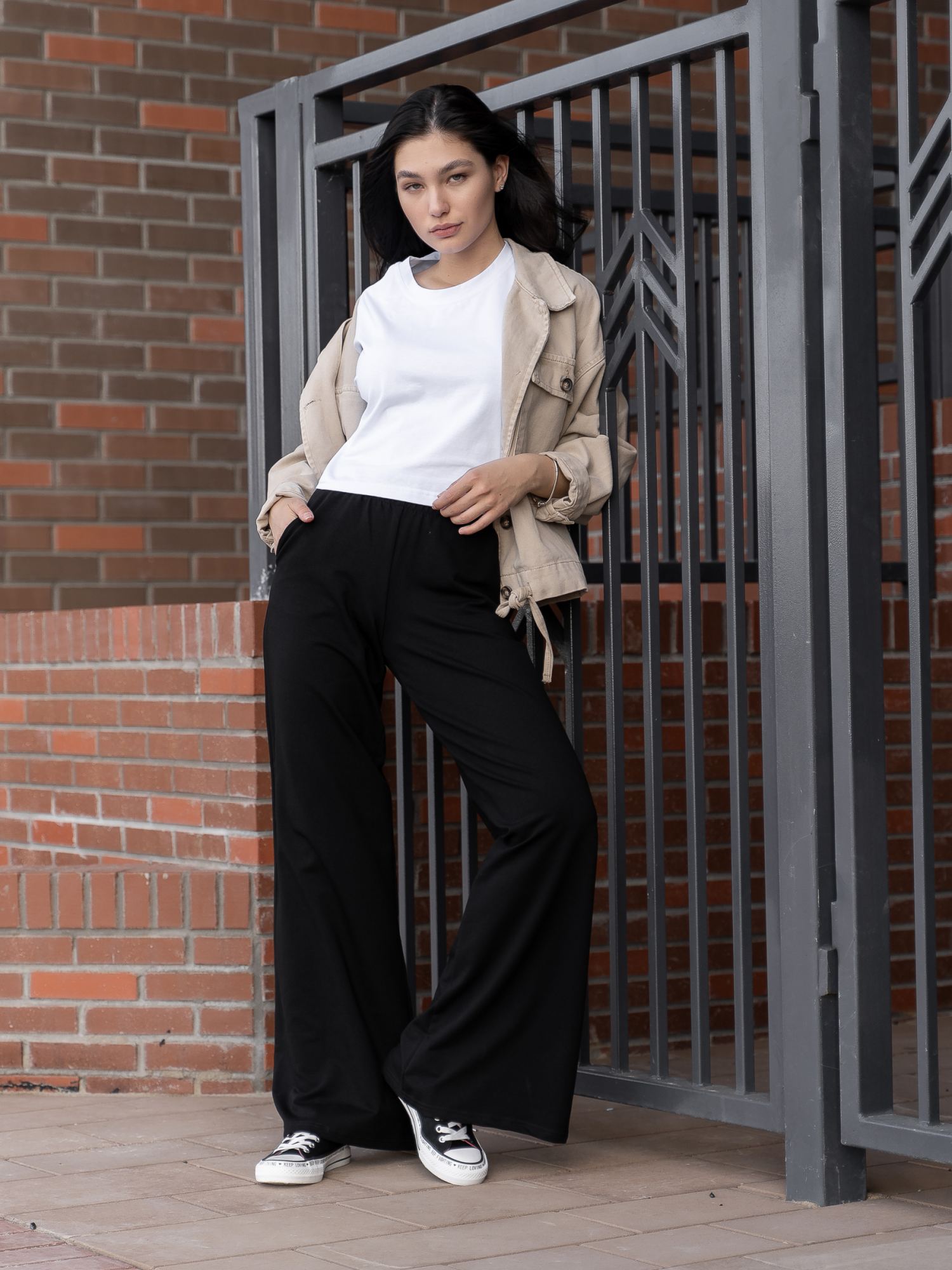 Женские брюки-палаццо из футера с начесом черного цвета свободного кроя с цельнокроенным широким поясом. В боковых швах - удобные карманы. Изделие выполнено из трикотажа премиального качества - ПЕНЬЕ, с содержанием хлопка более 80%